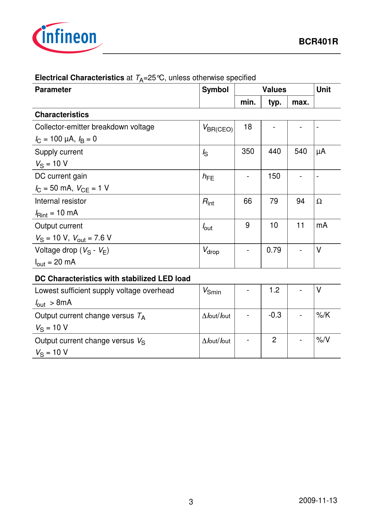 BCR401R. Electrical Characteristics. Parameter. Symbol. Values. Unit. min. typ. max. Characteristics