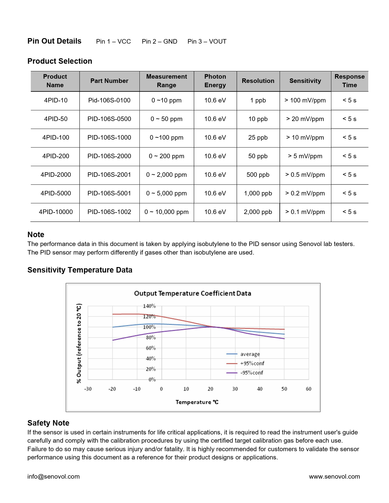 Pin Out Details Pin 1 – VCC Pin 2 – GND Pin 3 – VOUT Product Selection Product Measurement Photon Response Part Number Resolution Sensitivity Name Range Energy Time 4PID-10 Pid-106S-0100 0 ~10 ppm 10.6 eV 1 ppb > 100 mV/ppm < 5 s 4PID-50 PID-106S-0500 0 ~ 50 ppm 10.6 eV 10 ppb > 20 mV/ppm < 5 s 4PID-100 PID-106S-1000 0 ~100 ppm 10.6 eV 25 ppb > 10 mV/ppm < 5 s 4PID-200 PID-106S-2000 0 ~ 200 ppm 10.6 eV 50 ppb > 5 mV/ppm < 5 s 4PID-2000 PID-106S-2001 0 ~ 2,000 ppm 10.6 eV 500 ppb > 0.5 mV/ppm < 5 s 4PID-5000 PID-106S-5001 0 ~ 5,000 ppm 10.6 eV 1,000 ppb > 0.2 mV/ppm < 5 s 4PID-10000 PID-106S-1002 0 ~ 10,000 ppm 10.6 eV 2,000 ppb > 0.1 mV/ppm < 5 s Note The performance data in this document is taken by applying isobutylene to the PID sensor using Senovol lab testers. The PID sensor may perform differently if gases other than isobutylene are used. Sensitivity Temperature Data Safety Note If the sensor is used in certain instruments for life critical applications, it is required to read the instrument user's guide carefully and comply with the calibration procedures by using the certified target calibration gas before each use. Failure to do so may cause serious injury and/or fatality. It is highly recommended for customers to validate the sensor performance using this document as a reference for their product designs or applications. info@senovol.com www.senovol.com