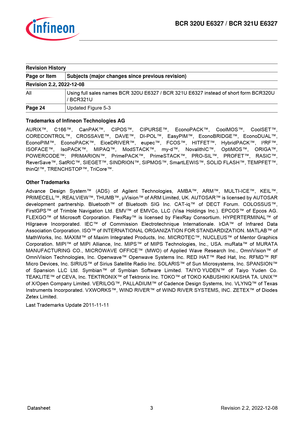 BCR 320U E6327 / BCR 321U E6327 Revision History Page or Item Subjects (major changes since previous revision) Revision 2.2, 2022-12-08