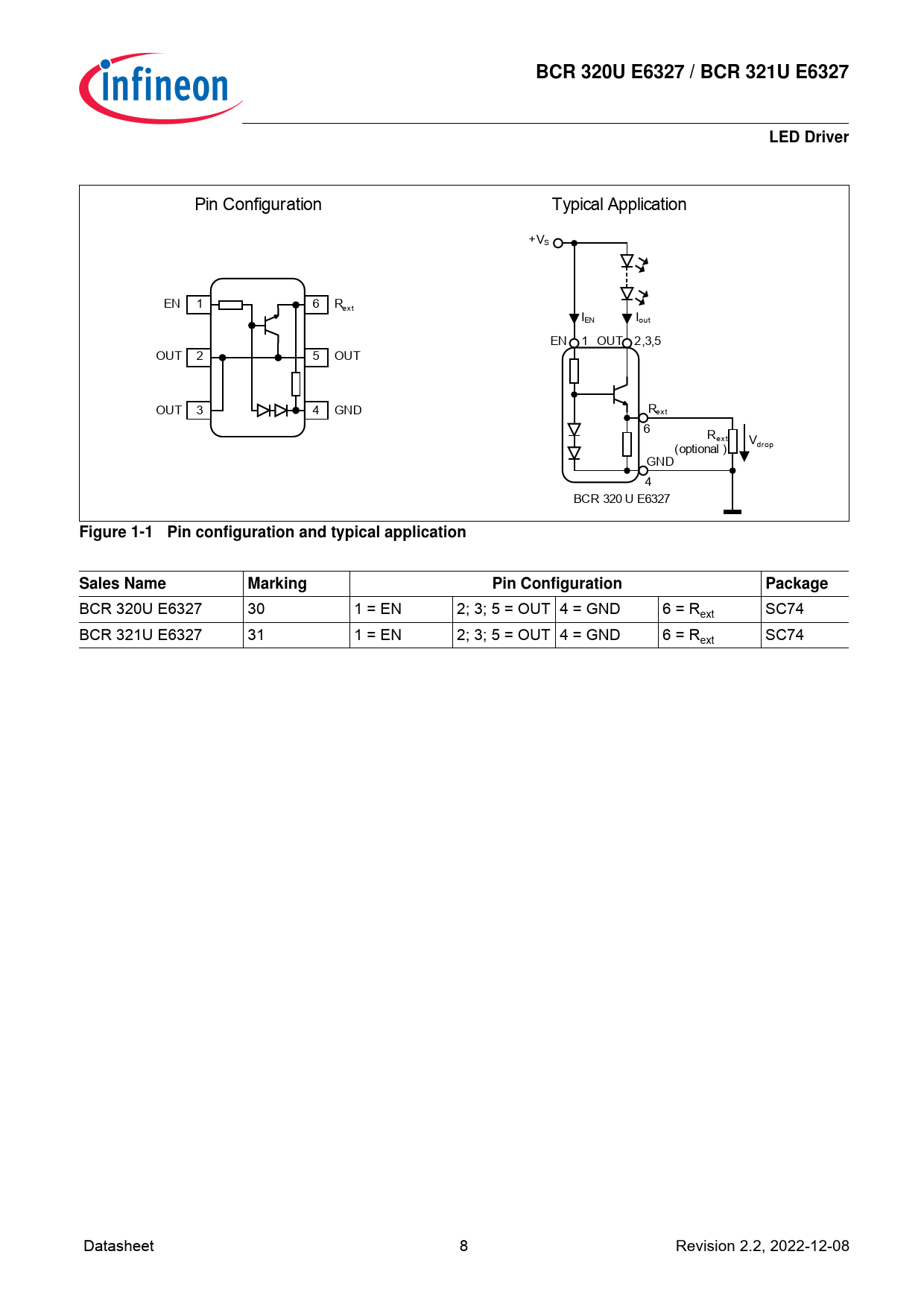 BCR 320U E6327 / BCR 321U E6327. LED Driver. Figure 1-1 Pin configuration and typical application. Sales Name. Marking