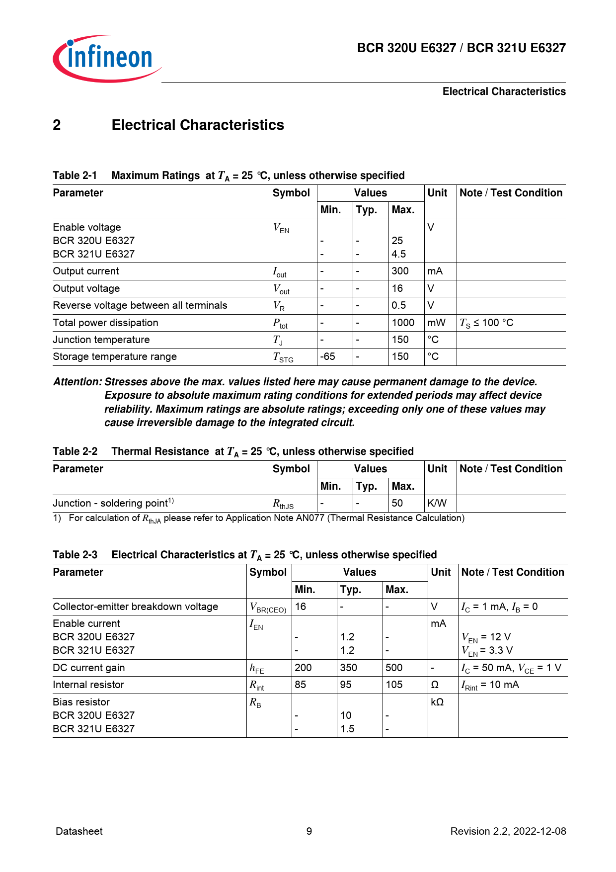 BCR 320U E6327 / BCR 321U E6327Electrical Characteristics2Electrical CharacteristicsTable 2-1Maximum Ratings at T= 25 °C, unless otherwise specifiedAParameterSymbolValuesUnitNote / Test ConditionMin.Typ.Max. Enable voltage VEN V BCR 320U E6327 - - 25 BCR 321U E6327 - - 4.5 Output current Iout - - 300 mA Output voltage Vout - - 16 V Reverse voltage between all terminals VR - - 0.5 V Total power dissipation Ptot - - 1000 mW TS ≤ 100 °C Junction temperature TJ - - 150 °C Storage temperature range TSTG -65 - 150 °C Attention: Stresses above the max. values listed here may cause permanent damage to the device.Exposure to absolute maximum rating conditions for extended periods may affect device reliability. Maximum ratings are absolute ratings; exceeding only one of these values may cause irreversible damage to the integrated circuit.Table 2-2Thermal Resistance at T= 25 °C, unless otherwise specifiedAParameterSymbolValuesUnitNote / Test ConditionMin.Typ.Max. Junction - soldering point1) RthJS - - 50 K/W 1) For calculation of RthJA please refer to Application Note AN077 (Thermal Resistance Calculation) Table 2-3Electrical Characteristics at T= 25 °C, unless otherwise specifiedAParameterSymbolValuesUnitNote / Test ConditionMin.Typ.Max. Collector-emitter breakdown voltage VBR(CEO) 16 - - V IC = 1 mA, IB = 0 Enable current IEN mA BCR 320U E6327 - 1.2 - VEN = 12 V BCR 321U E6327 - 1.2 - VEN = 3.3 V DC current gain hFE 200 350 500 - IC = 50 mA, VCE = 1 V Internal resistor Rint 85 95 105 Ω IRint = 10 mA Bias resistor RB kΩ BCR 320U E6327 - 10 - BCR 321U E6327 - 1.5 - Datasheet 9 Revision 2.2, 2022-12-08 Document Outline Table of Contents List of Figures List of Tables 1 LED Driver 1.1 Features 1.2 Applications 1.3 General Description 2 Electrical Characteristics 3 Typical characteristics 4 Application hints 5 Package Terminology