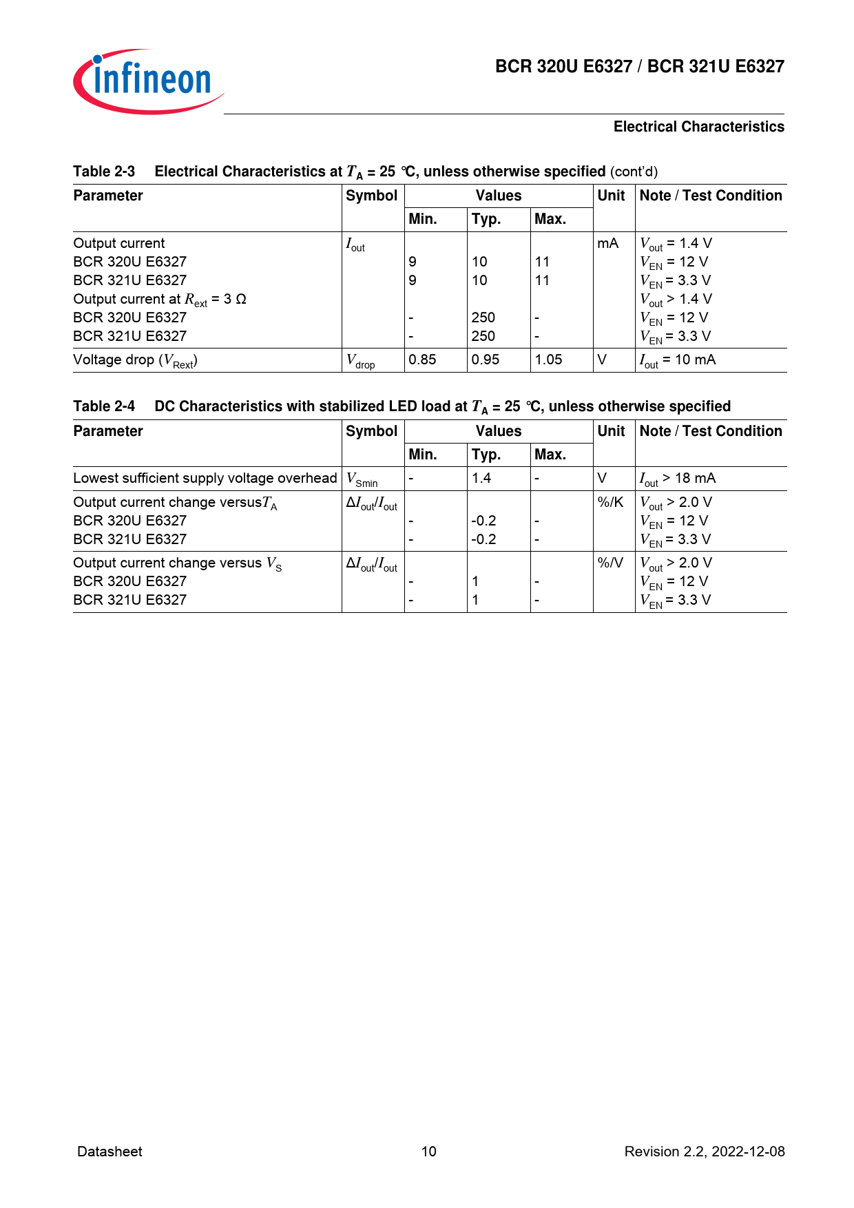 BCR 320U E6327 / BCR 321U E6327Electrical CharacteristicsTable 2-3Electrical Characteristics at T= 25 °C, unless otherwise specified (cont’d) AParameterSymbolValuesUnitNote / Test ConditionMin.Typ.Max. Output current Iout mA Vout = 1.4 V BCR 320U E6327 9 10 11 VEN = 12 V BCR 321U E6327 9 10 11 VEN = 3.3 V Output current at Rext = 3 Ω Vout > 1.4 V BCR 320U E6327 - 250 - VEN = 12 V BCR 321U E6327 - 250 - VEN = 3.3 V Voltage drop (VRext) Vdrop 0.85 0.95 1.05 V Iout = 10 mA Table 2-4DC Characteristics with stabilized LED load at T= 25 °C, unless otherwise specifiedAParameterSymbolValuesUnitNote / Test ConditionMin.Typ.Max. Lowest sufficient supply voltage overhead VSmin - 1.4 - V Iout > 18 mA Output current change versusTA ∆Iout/Iout %/K Vout > 2.0 V BCR 320U E6327 - -0.2 - VEN = 12 V BCR 321U E6327 - -0.2 - VEN = 3.3 V Output current change versus VS ∆Iout/Iout %/V Vout > 2.0 V BCR 320U E6327 - 1 - VEN = 12 V BCR 321U E6327 - 1 - VEN = 3.3 V Datasheet 10 Revision 2.2, 2022-12-08 Document Outline Table of Contents List of Figures List of Tables 1 LED Driver 1.1 Features 1.2 Applications 1.3 General Description 2 Electrical Characteristics 3 Typical characteristics 4 Application hints 5 Package Terminology
