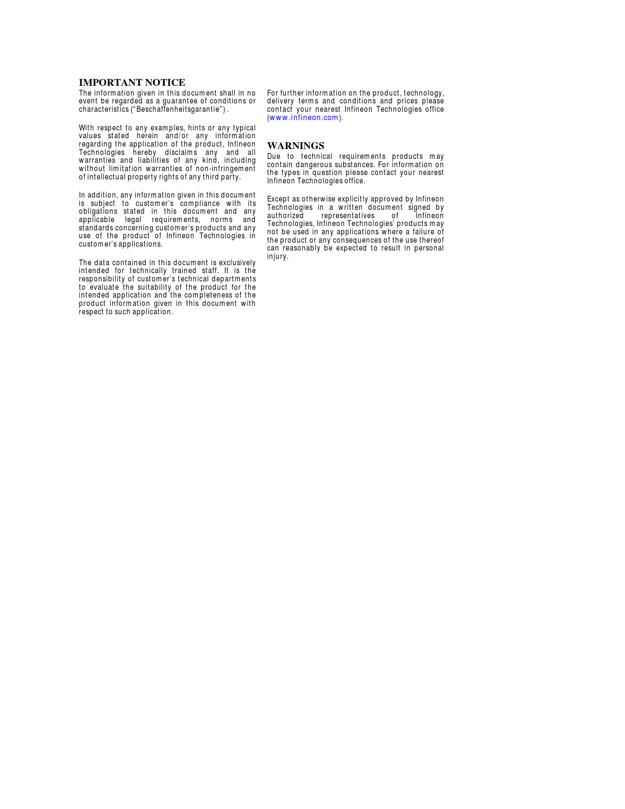IMPORTANT NOTICE The information given in this document shall in no For further information on the product, technology, event be regarded as a guarantee of conditions or delivery terms and conditions and prices please characteristics (“Beschaffenheitsgarantie”) . contact your nearest Infineon Technologies office ( www.infineon.com ). With respect to any examples, hints or any typical values stated herein and/or any information regarding the application of the product, Infineon Technologies hereby disclaims any and all WARNINGS warranties and liabilities of any kind, including Due to technical requirements products may without limitation warranties of non-infringement contain dangerous substances. For information on of intellectual property rights of any third party. the types in question please contact your nearest Infineon Technologies office. In addition, any information given in this document is subject to customer’s compliance with its Except as otherwise explicitly approved by Infineon obligations stated in this document and any Technologies in a written document signed by applicable legal requirements, norms and authorized representatives of Infineon standards concerning customer’s products and any Technologies, Infineon Technologies’ products may use of the product of Infineon Technologies in not be used in any applications where a failure of customer’s applications. the product or any consequences of the use thereof can reasonably be expected to result in personal injury. The data contained in this document is exclusively intended for technically trained staff. It is the responsibility of customer’s technical departments to evaluate the suitability of the product for the intended application and the completeness of the product information given in this document with respect to such application.