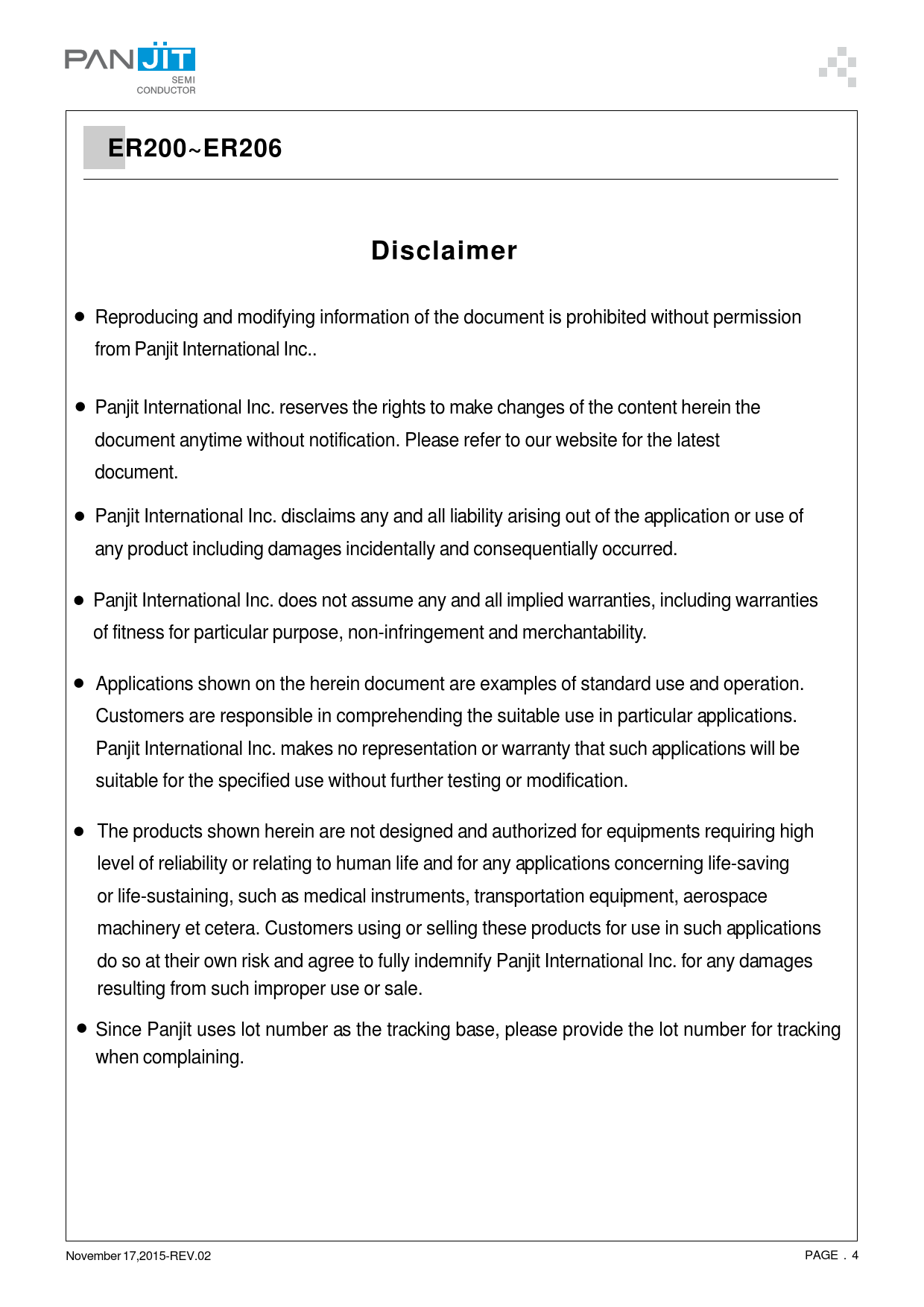 resulting from such improper use or sale. • Since Panjit uses lot number as the tracking base, please provide the lot number for tracking
