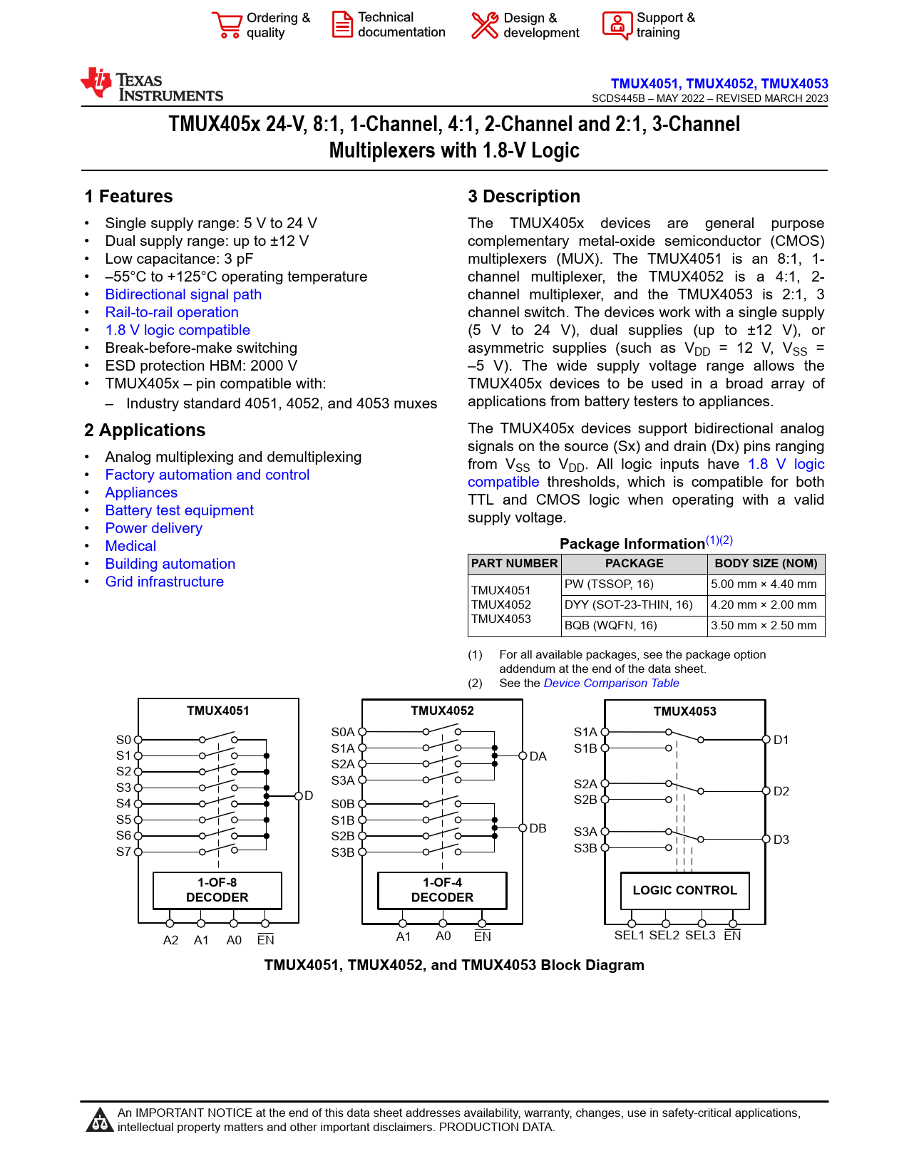 Datasheet TMUX4051, TMUX4052, TMUX4053 Texas Instruments