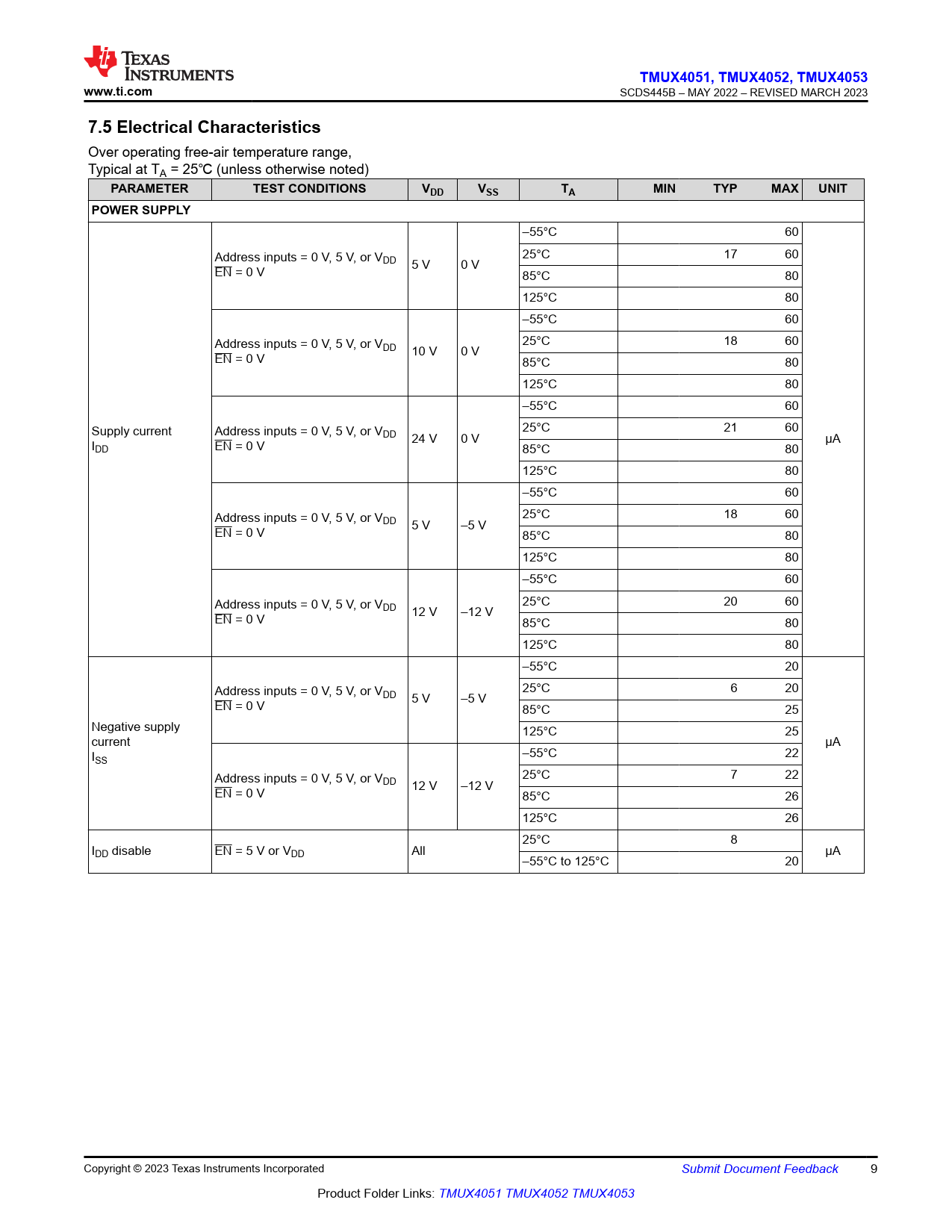 TMUX4051, TMUX4052. , TMUX4053. www.ti.com. 7.5 Electrical Characteristics. PARAMETER. TEST CONDITIONS. VDD. VSS. MIN. TYP. MAX. UNIT