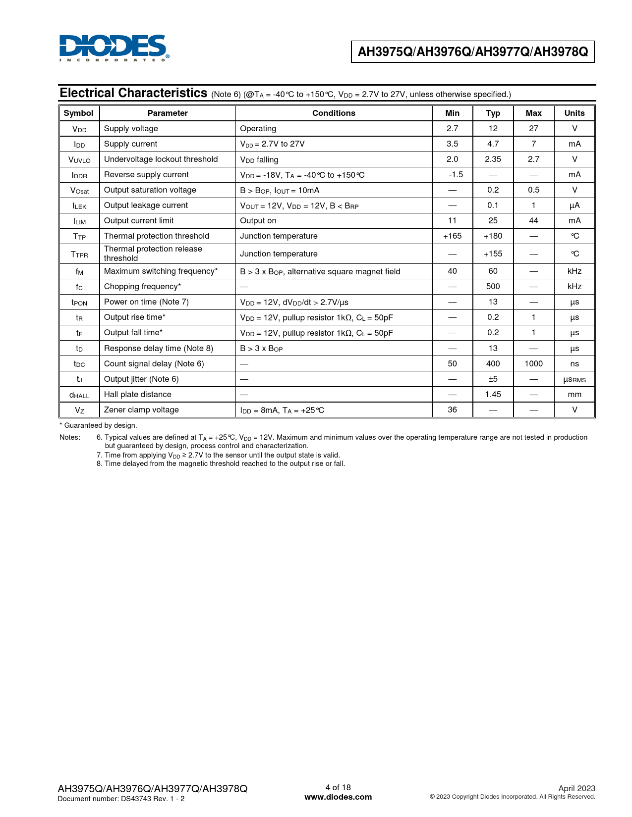 AH3975Q/AH3976Q/AH3977Q/AH3978Q. Electrical Characteristics. Symbol. Parameter. Conditions. Min. Typ. Max. Units. www.diodes.com
