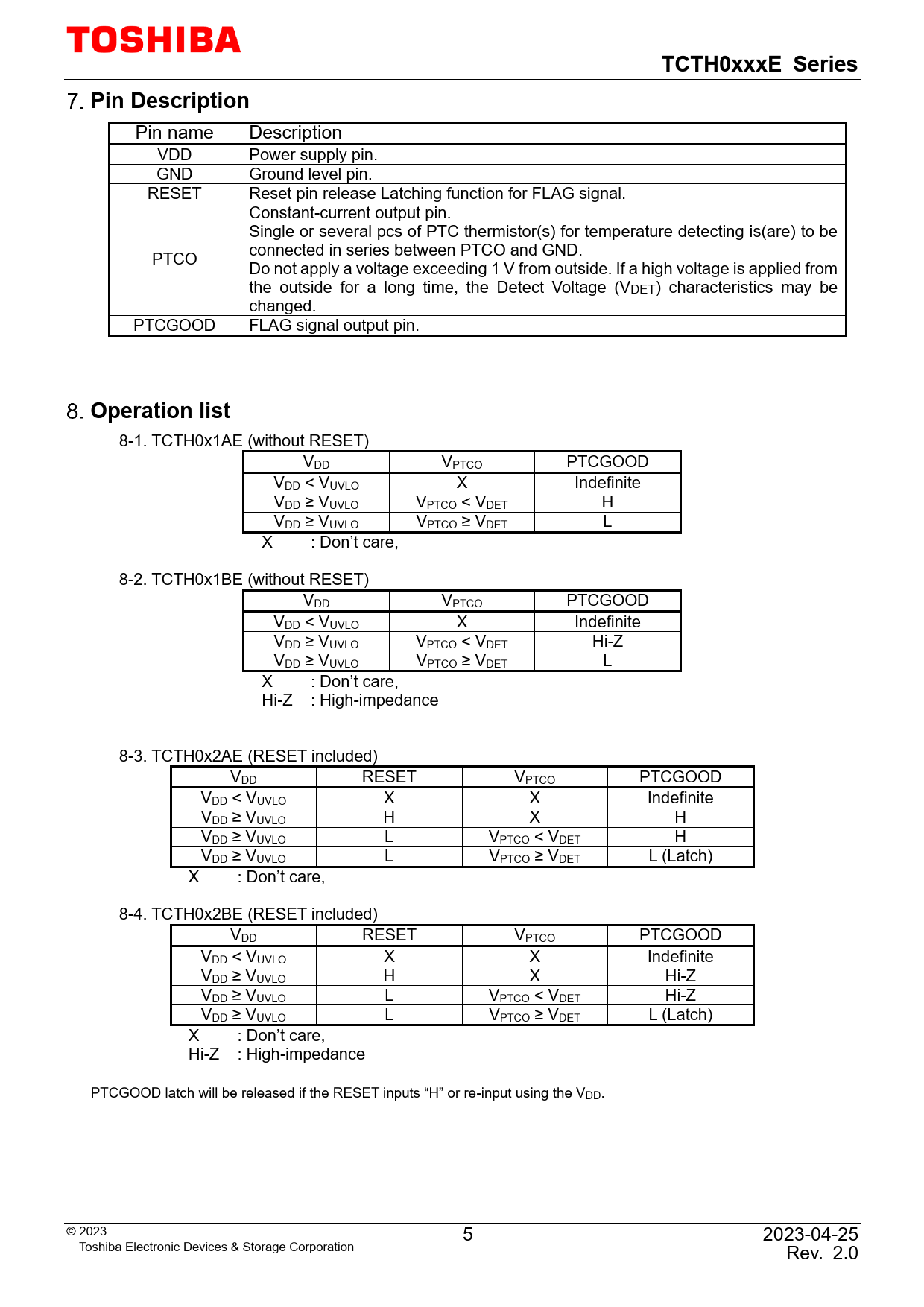 8-1. TCTH0x1AE (without RESET) VDD VPTCO PTCGOOD VDD < VUVLO X Indefinite VDD ≥ VUVLO VPTCO < VDET H VDD ≥ VUVLO VPTCO ≥ VDET L X : Don’t care, 8-2. TCTH0x1BE (without RESET) VDD VPTCO PTCGOOD VDD < VUVLO X Indefinite VDD ≥ VUVLO VPTCO < VDET Hi-Z VDD ≥ VUVLO VPTCO ≥ VDET L X : Don’t care, Hi-Z : High-impedance 8-3. TCTH0x2AE (RESET included) VDD RESET VPTCO PTCGOOD VDD < VUVLO X X Indefinite VDD ≥ VUVLO H X H VDD ≥ VUVLO L VPTCO < VDET H VDD ≥ VUVLO L VPTCO ≥ VDET L (Latch) X : Don’t care, 8-4. TCTH0x2BE (RESET included) VDD RESET VPTCO PTCGOOD VDD < VUVLO X X Indefinite VDD ≥ VUVLO H X Hi-Z VDD ≥ VUVLO L VPTCO < VDET Hi-Z VDD ≥ VUVLO L VPTCO ≥ VDET L (Latch) X : Don’t care, Hi-Z : High-impedance PTCGOOD latch wil be released if the RESET inputs “H” or re-input using the VDD. © 2023 5 2023-04-25 Toshiba Electronic Devices & Storage Corporation Rev. 2.0