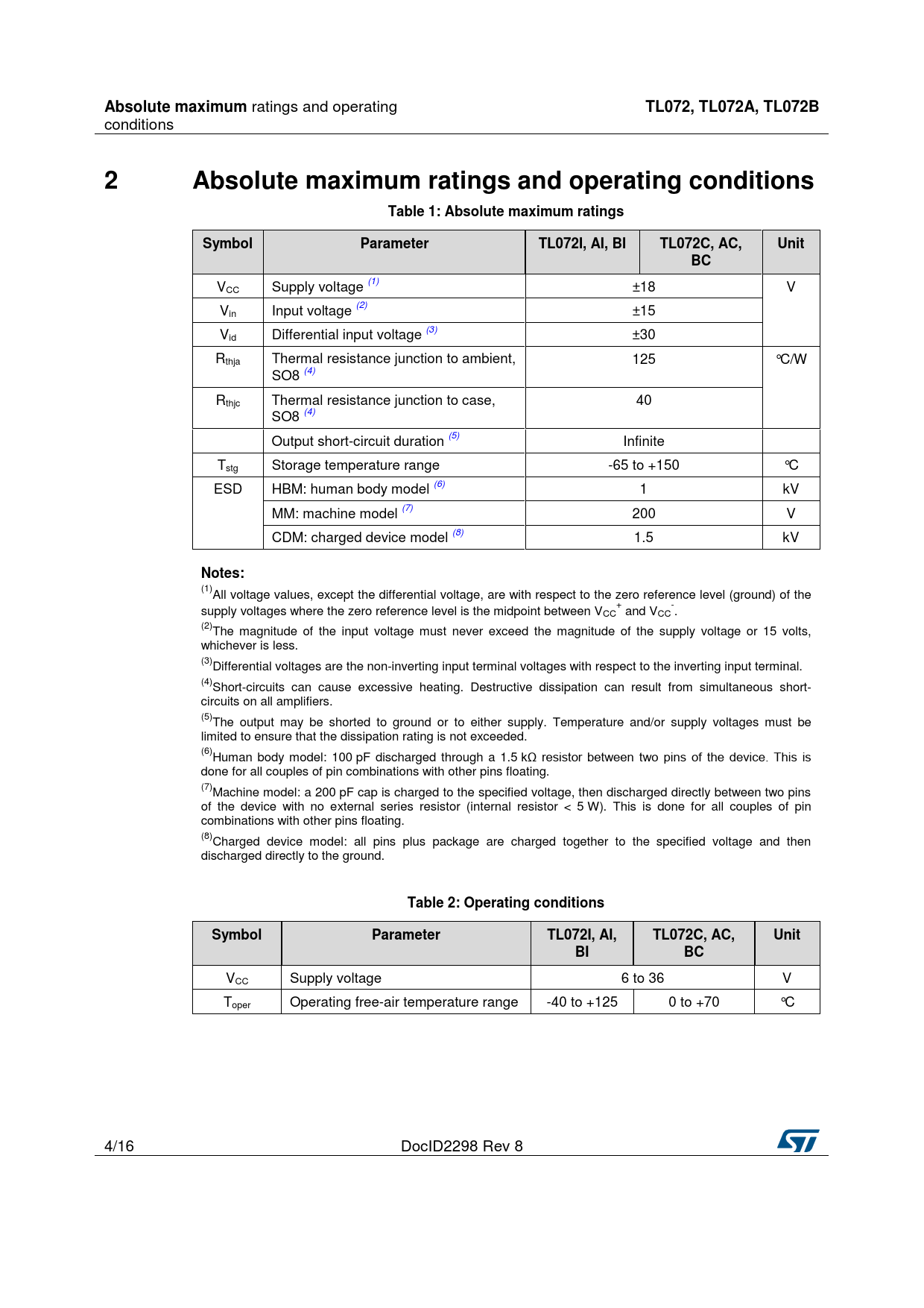 link to page 4 link to page 4 link to page 4 link to page 4 link to page 4 link to page 4 link to page 4 link to page 4 link to page 4 Absolute maximum ratings and operating TL072, TL072A, TL072B conditions 2Absolute maximum ratings and operating conditionsTable 1: Absolute maximum ratingsSymbolParameterTL072I, AI, BITL072C, AC,UnitBC VCC Supply voltage (1) ±18 V Vin Input voltage (2) ±15 Vid Differential input voltage (3) ±30 Rthja Thermal resistance junction to ambient, 125 °C/W SO8 (4) Rthjc Thermal resistance junction to case, 40 SO8 (4) Output short-circuit duration (5) Infinite Tstg Storage temperature range -65 to +150 °C ESD HBM: human body model (6) 1 kV MM: machine model (7) 200 V CDM: charged device model (8) 1.5 kV Notes: (1)All voltage values, except the differential voltage, are with respect to the zero reference level (ground) of the + - supply voltages where the zero reference level is the midpoint between VCC and VCC . (2)The magnitude of the input voltage must never exceed the magnitude of the supply voltage or 15 volts, whichever is less. (3)Differential voltages are the non-inverting input terminal voltages with respect to the inverting input terminal. (4)Short-circuits can cause excessive heating. Destructive dissipation can result from simultaneous short- circuits on all amplifiers. (5)The output may be shorted to ground or to either supply. Temperature and/or supply voltages must be limited to ensure that the dissipation rating is not exceeded. (6)Human body model: 100 pF discharged through a 1.5 kΩ resistor between two pins of the device. This is done for all couples of pin combinations with other pins floating. (7)Machine model: a 200 pF cap is charged to the specified voltage, then discharged directly between two pins of the device with no external series resistor (internal resistor < 5 W). This is done for all couples of pin combinations with other pins floating. (8)Charged device model: all pins plus package are charged together to the specified voltage and then discharged directly to the ground. Table 2: Operating conditionsSymbolParameterTL072I, AI,TL072C, AC,UnitBIBC VCC Supply voltage 6 to 36 V Toper Operating free-air temperature range -40 to +125 0 to +70 °C 4/16 DocID2298 Rev 8 Document Outline 1 Schematic diagram 2 Absolute maximum ratings and operating conditions 3 Electrical characteristics 4 Parameter measurement information 5 Typical application 6 Package information 6.1 SO8 package information 7 Ordering information 8 Revision history