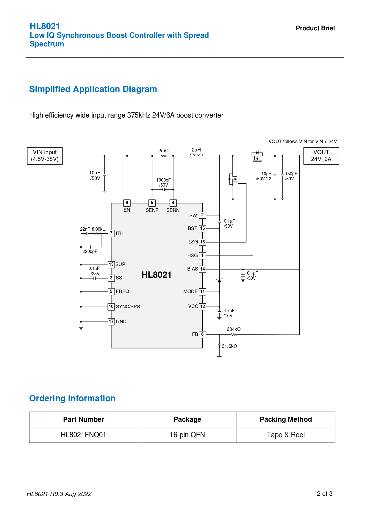| Pages / Page | 3 / 2 — HL8021. Product Brief. Low IQ Synchronous Boost Controller with Spread. … |