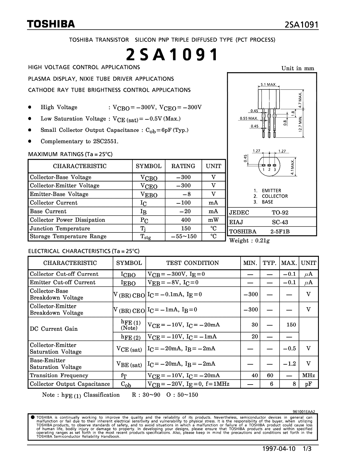 Datasheet 2SA1091 (Toshiba)