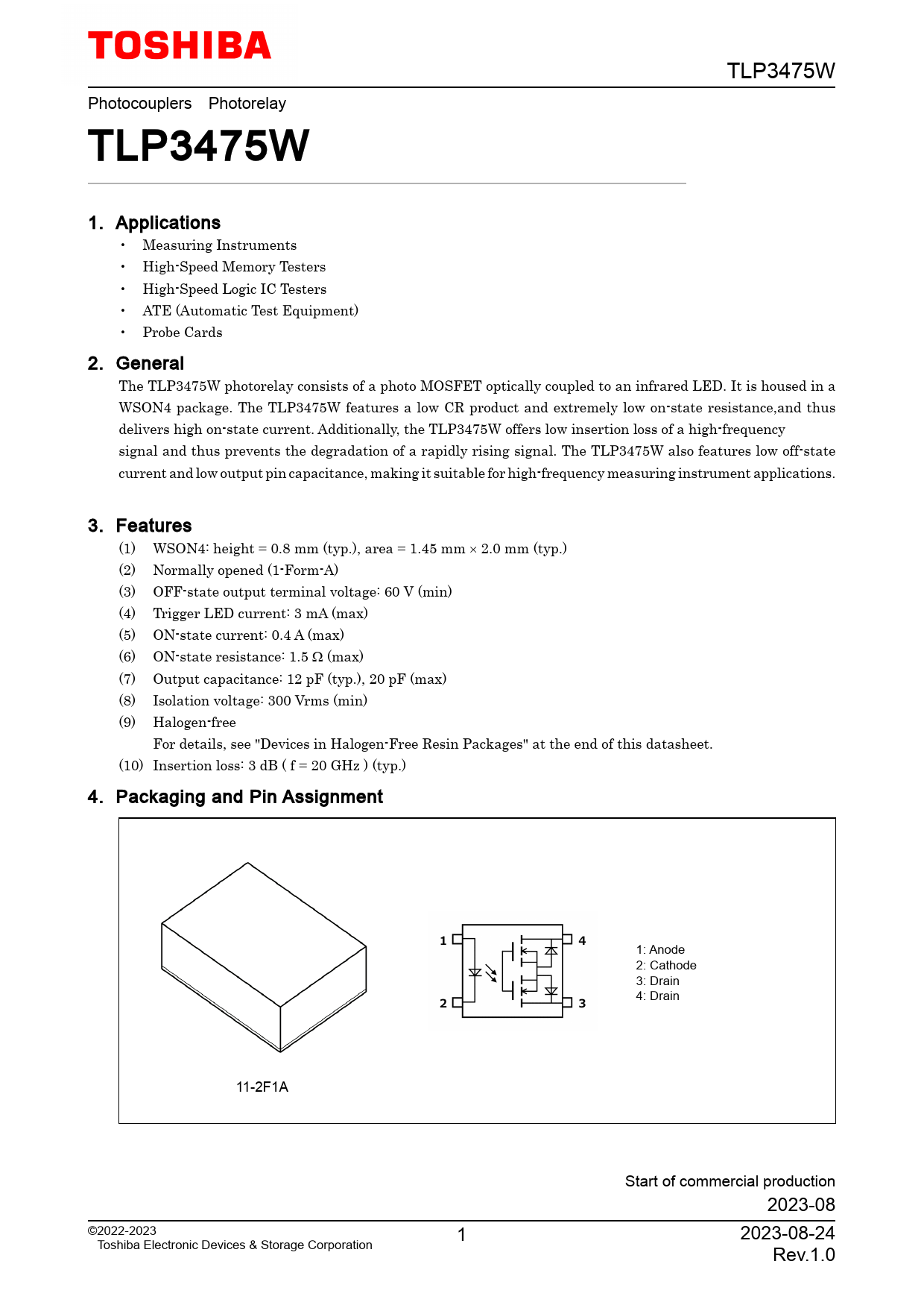 TLP3475W Photocouplers Photorelay TLP3475W 1. Applications • Measuring Instruments • High-Speed Memory Testers • High-Speed Logic IC Testers • ATE (Automatic Test Equipment) • Probe Cards 2. General The TLP3475W photorelay consists of a photo MOSFET optically coupled to an infrared LED. It is housed in a WSON4 package. The TLP3475W features a low CR product and extremely low on-state resistance,and thus delivers high on-state current. Additionally, the TLP3475W offers low insertion loss of a high-frequency signal and thus prevents the degradation of a rapidly rising signal. The TLP3475W also features low off-state current and low output pin capacitance, making it suitable for high-frequency measuring instrument applications. 3. Features (1) WSON4: height = 0.8 mm (typ.), area = 1.45 mm × 2.0 mm (typ.) (2) Normally opened (1-Form-A) (3) OFF-state output terminal voltage: 60 V (min) (4) Trigger LED current: 3 mA (max) (5) ON-state current: 0.4 A (max) (6) ON-state resistance: 1.5 Ω (max) (7) Output capacitance: 12 pF (typ.), 20 pF (max) (8) Isolation voltage: 300 Vrms (min) (9) Halogen-free For details, see "Devices in Halogen-Free Resin Packages" at the end of this datasheet. (10) Insertion loss: 3 dB ( f = 20 GHz ) (typ.) 4. Packaging and Pin Assignment 1: Anode 2: Cathode 3: Drain 4: Drain 11-2F1A Start of commercial production 2023-08 ©2022-2023 1 2023-08-24 Toshiba Electronic Devices & Storage Corporation Rev.1.0