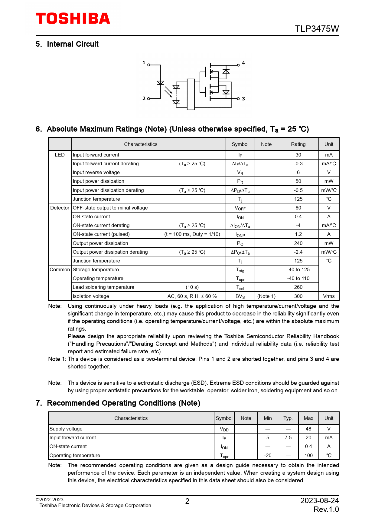 TLP3475W. 5. Internal. Circuit. 6. Absolute. Maximum. Ratings. (Note). (Unless. otherwise. specified,. Ta. =. 25. �). Characteristics. Symbol. Note. Rating