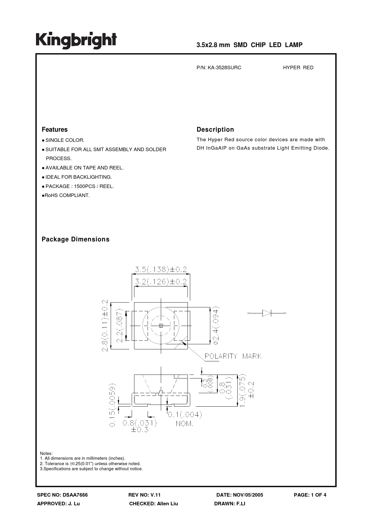 3.5x2.8 mm SMD CHIP LED LAMP. Features. Description. Package Dimensions. SPEC NO:. REV NO: V.11. DATE: NOV/05/2005. PAGE: 1 OF 4