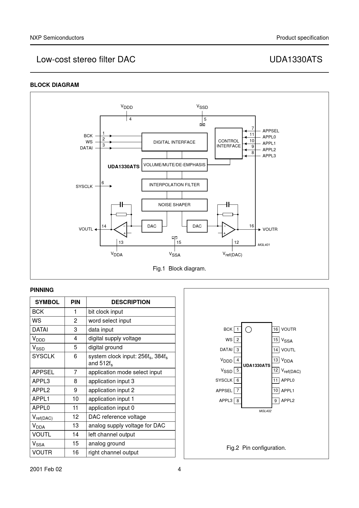 BLOCK DIAGRAM. UDA1330ATS. PINNING. SYMBOL. PIN. DESCRIPTION