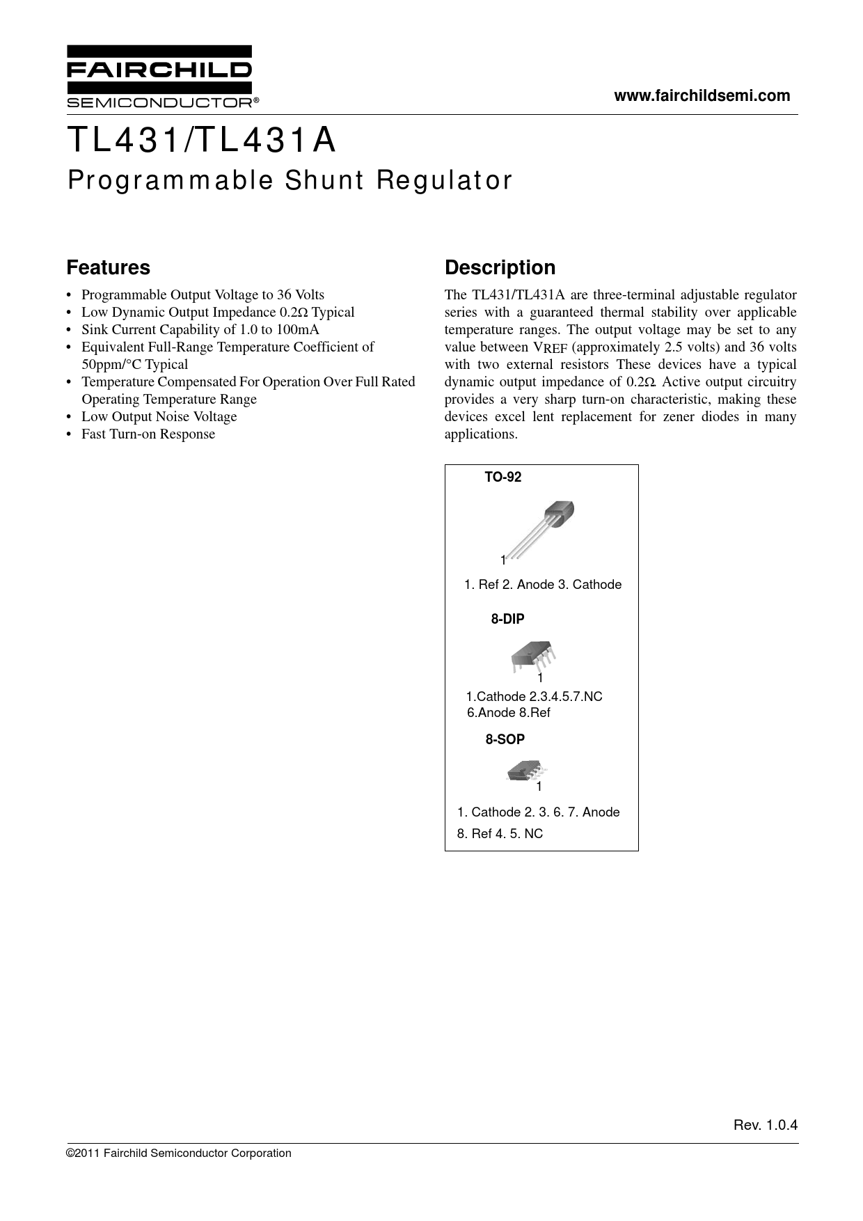 1 1. Cathode 2. 3. 6. 7. Anode 8. Ref 4. 5. NC Rev. 1.0.4 ©2011 Fairchild Semiconductor Corporation