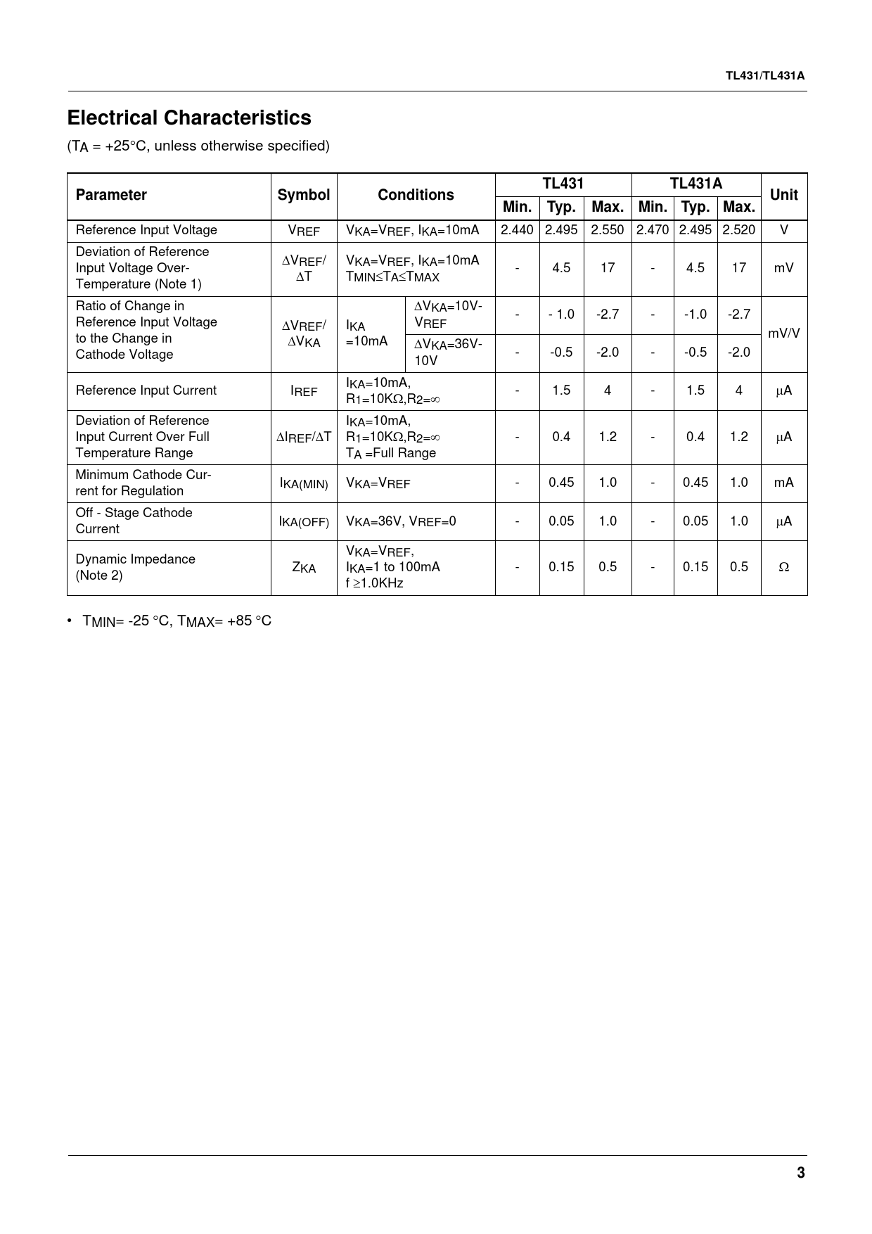 | Pages / Page | 10 / 3 — TL431/TL431A. Electrical Characteristics. TL431. TL431A. Parameter. … |