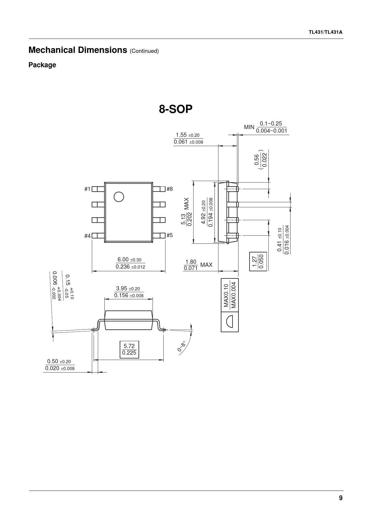 | Pages / Page | 10 / 9 — TL431/TL431A. Mechanical Dimensions. Package. 8-SOP |