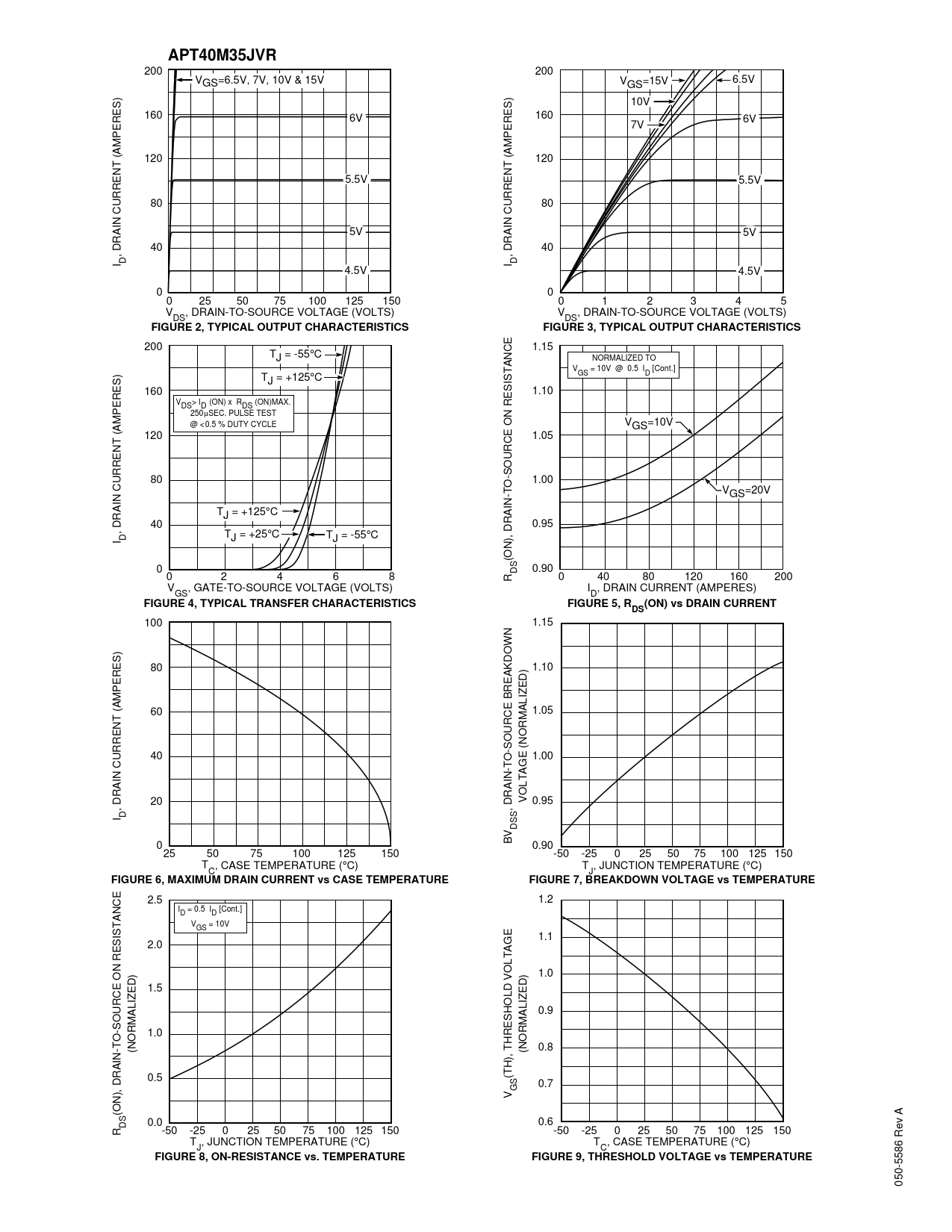 APT40M35JVR 200 200 VGS=6.5V, 7V, 10V & 15V V 6.5V GS=15V 10V 160 160 6V 6V 7V 120 120 5.5V 5.5V 80 80 5V 5V 40 40 , DRAIN CURRENT (AMPERES) , DRAIN CURRENT (AMPERES) I D I D 4.5V 4.5V 0 0 0 25 50 75 100 125 150 0 1 2 3 4 5 V , DRAIN-TO-SOURCE VOLTAGE (VOLTS) V , DRAIN-TO-SOURCE VOLTAGE (VOLTS) DS DS FIGURE 2, TYPICAL OUTPUT CHARACTERISTICSFIGURE 3, TYPICAL OUTPUT CHARACTERISTICS 200 1.15 TJ = -55°C NORMALIZED TO V = 10V @ 0.5 I [Cont.] T GS D J = +125°C 160 1.10 VDS> ID (ON) x RDS (ON)MAX. 250µSEC. PULSE TEST @ <0.5 % DUTY CYCLE VGS=10V 120 1.05 80 1.00 VGS=20V TJ = +125°C 40 0.95 , DRAIN CURRENT (AMPERES) T I D J = +25°C TJ = -55°C (ON), DRAIN-TO-SOURCE ON RESISTANCE 0 DS 0.90 0 2 4 6 8 R 0 40 80 120 160 200 V , GATE-TO-SOURCE VOLTAGE (VOLTS) I , DRAIN CURRENT (AMPERES) GS D FIGURE 4, TYPICAL TRANSFER CHARACTERISTICSFIGURE 5, R(ON) vs DRAIN CURRENTDS 100 1.15 80 1.10 60 1.05 40 1.00 VOLTAGE (NORMALIZED) 20 0.95 , DRAIN CURRENT (AMPERES) , DRAIN-TO-SOURCE BREAKDOWN I D DSS BV 0 0.90 25 50 75 100 125 150 -50 -25 0 25 50 75 100 125 150 T , CASE TEMPERATURE (°C) T , JUNCTION TEMPERATURE (°C) C J FIGURE 6, MAXIMUM DRAIN CURRENT vs CASE TEMPERATUREFIGURE 7, BREAKDOWN VOLTAGE vs TEMPERATURE 2.5 1.2 I = 0.5 I [Cont.] D D V = 10V GS 1.1 2.0 1.0 1.5 0.9 1.0 (NORMALIZED) (NORMALIZED) 0.8 (TH), THRESHOLD VOLTAGE 0.5 0.7 GS V (ON), DRAIN-TO-SOURCE ON RESISTANCE DS 0.0 0.6 R -50 -25 0 25 50 75 100 125 150 -50 -25 0 25 50 75 100 125 150 T , JUNCTION TEMPERATURE (°C) T , CASE TEMPERATURE (°C) J C FIGURE 8, ON-RESISTANCE vs. TEMPERATUREFIGURE 9, THRESHOLD VOLTAGE vs TEMPERATURE 050-5586 Rev A
