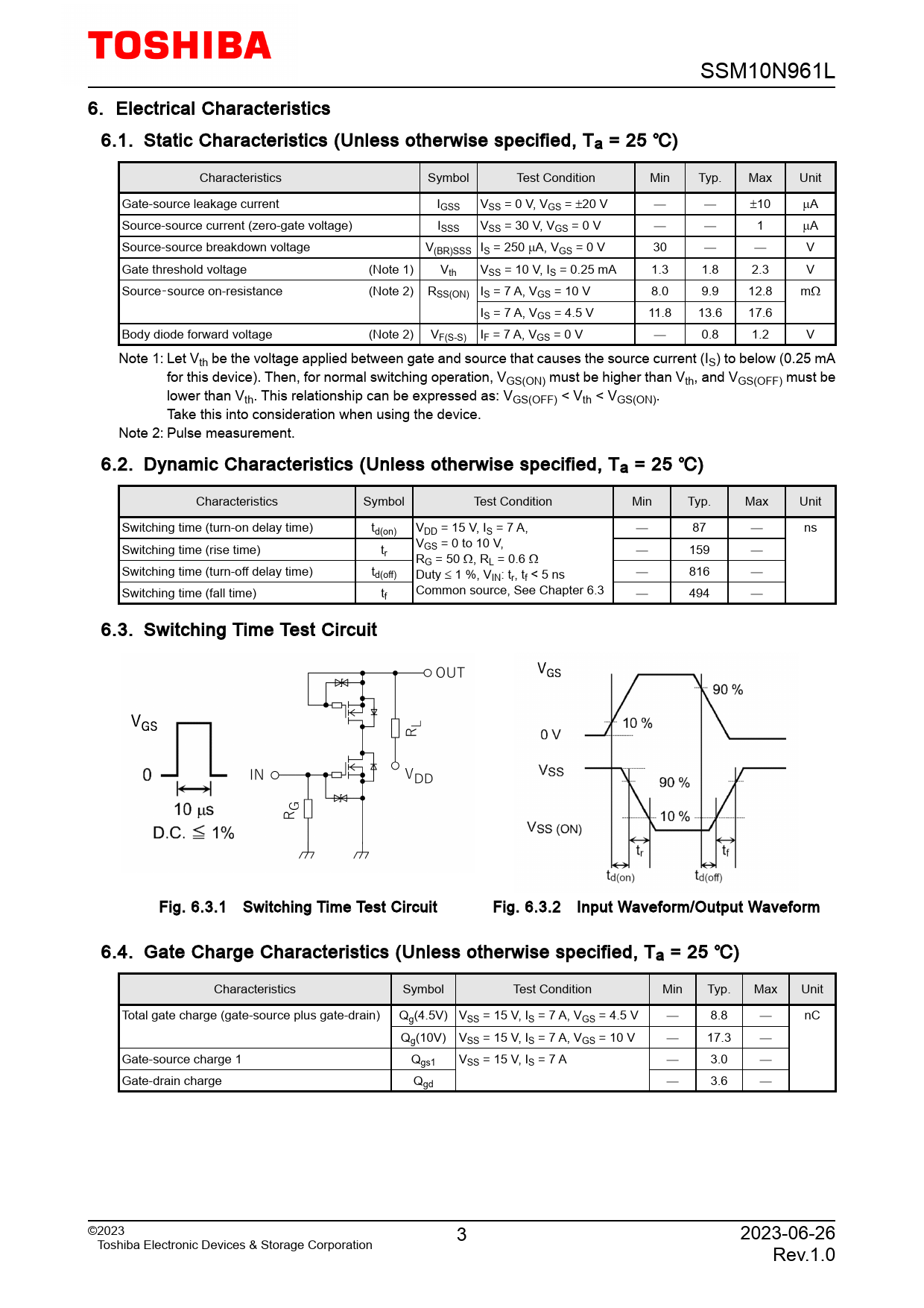 SSM10N961L 6. Electrical Characteristics 6.1. Static Characteristics (Unless otherwise specified, Ta = 25 �) Characteristics Symbol Test Condition Min Typ. Max Unit Gate-source leakage current IGSS VSS = 0 V, VGS = ±20 V � � ±10 µA Source-source current (zero-gate voltage) ISSS VSS = 30 V, VGS = 0 V � � 1 µA Source-source breakdown voltage V(BR)SSS IS = 250 µA, VGS = 0 V 30 � � V Gate threshold voltage (Note 1) Vth VSS = 10 V, IS = 0.25 mA 1.3 1.8 2.3 V Source–source on-resistance (Note 2) RSS(ON) IS = 7 A, VGS = 10 V 8.0 9.9 12.8 mΩ IS = 7 A, VGS = 4.5 V 11.8 13.6 17.6 Body diode forward voltage (Note 2) VF(S-S) IF = 7 A, VGS = 0 V � 0.8 1.2 V Note 1: Let Vth be the voltage applied between gate and source that causes the source current (IS) to below (0.25 mA for this device). Then, for normal switching operation, VGS(ON) must be higher than Vth, and VGS(OFF) must be lower than Vth. This relationship can be expressed as: VGS(OFF) < Vth < VGS(ON). Take this into consideration when using the device. Note 2: Pulse measurement. 6.2. Dynamic Characteristics (Unless otherwise specified, Ta = 25 �) Characteristics Symbol Test Condition Min Typ. Max Unit Switching time (turn-on delay time) td(on) VDD = 15 V, IS = 7 A, � 87 � ns Switching time (rise time) t VGS = 0 to 10 V, r � 159 � RG = 50 Ω, RL = 0.6 Ω Switching time (turn-off delay time) td(off) Duty ≤ 1 %, VIN: tr, tf < 5 ns � 816 � Switching time (fall time) tf Common source, See Chapter 6.3 � 494 � 6.3. Switching Time Test Circuit Fig. 6.3.1 Switching Time Test Circuit Fig. 6.3.2 Input Waveform/Output Waveform 6.4. Gate Charge Characteristics (Unless otherwise specified, Ta = 25 �) Characteristics Symbol Test Condition Min Typ. Max Unit Total gate charge (gate-source plus gate-drain) Qg(4.5V) VSS = 15 V, IS = 7 A, VGS = 4.5 V � 8.8 � nC Qg(10V) VSS = 15 V, IS = 7 A, VGS = 10 V � 17.3 � Gate-source charge 1 Qgs1 VSS = 15 V, IS = 7 A � 3.0 � Gate-drain charge Qgd � 3.6 � ©2023 3 2023-06-26 Toshiba Electronic Devices & Storage Corporation Rev.1.0