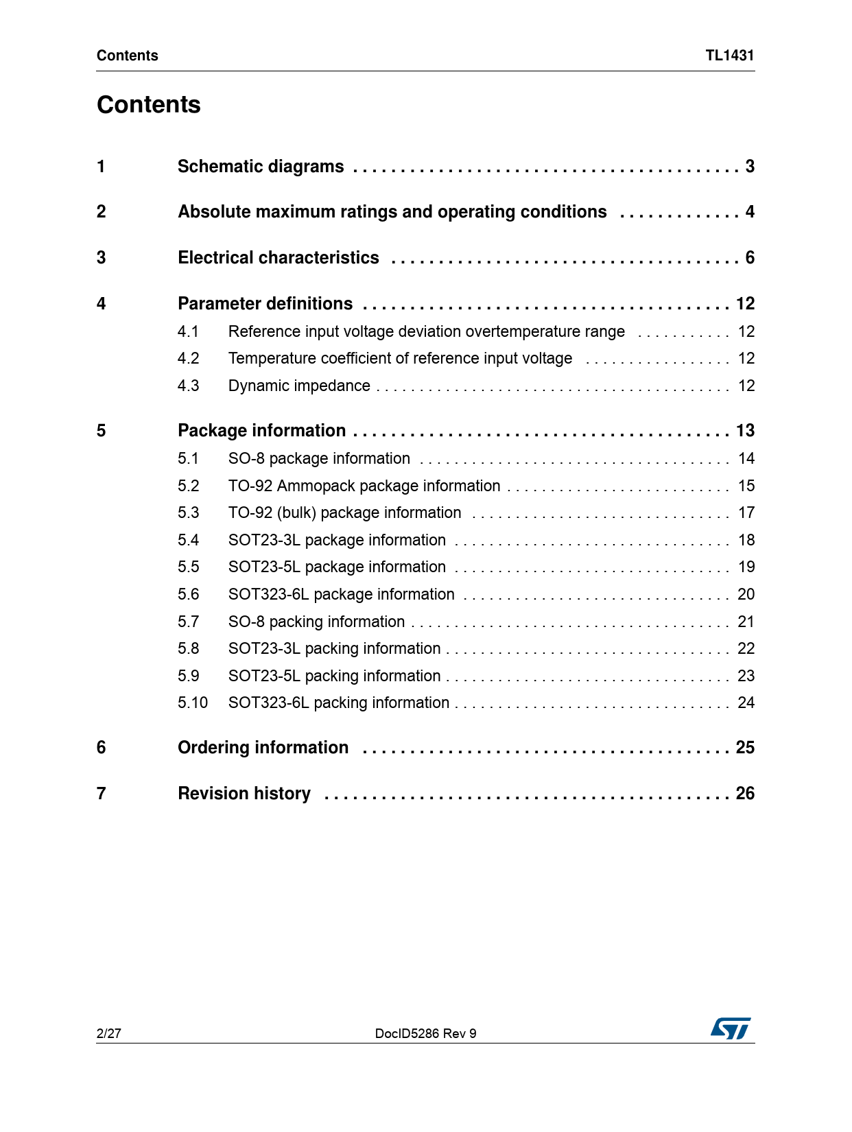 link to page 3 link to page 4 link to page 6 link to page 12 link to page 12 link to page 12 link to page 12 link to page 13 link to page 14 link to page 15 link to page 17 link to page 18 link to page 19 link to page 20 link to page 21 link to page 22 link to page 23 link to page 24 link to page 25 link to page 26 ContentsTL1431Contents1Schematic diagrams . 32Absolute maximum ratings and operating conditions . 43Electrical characteristics . 64Parameter definitions . 12 4.1 Reference input voltage deviation overtemperature range . 12 4.2 Temperature coefficient of reference input voltage . 12 4.3 Dynamic impedance . 12 5Package information . 13 5.1 SO-8 package information . 14 5.2 TO-92 Ammopack package information . 15 5.3 TO-92 (bulk) package information . 17 5.4 SOT23-3L package information . 18 5.5 SOT23-5L package information . 19 5.6 SOT323-6L package information . 20 5.7 SO-8 packing information . 21 5.8 SOT23-3L packing information . 22 5.9 SOT23-5L packing information . 23 5.10 SOT323-6L packing information . 24 6Ordering information . 257Revision history . 26 2/27 DocID5286 Rev 9 Document Outline 1 Schematic diagrams Figure 1. TO-92 pin connections (top view) Figure 2. SO-8 batwing pin connections (top view) Figure 3. SOT23-5L and SOT23-3L pin connections (top view) Figure 4. SOT323-6L pin connections (top view) Figure 5. Block diagram 2 Absolute maximum ratings and operating conditions Table 1. Absolute maximum ratings Table 2. Operating conditions Table 3. Thermal data 3 Electrical characteristics Table 4. Electrical characteristics for TL1431C, TL1431AC Table 5. Electrical characteristics for TL1431I, TL1431AI Table 6. Electrical characteristics for TL1431IY, TL1431AIY Figure 6. Test circuit VKA = VREF Figure 7. Test circuit for VKA > VREF Figure 8. Test circuit for IOFF Figure 9. Test circuit for phase margin and voltage gain Figure 10. Test circuit for response time Figure 11. Reference voltage vs. temperature Figure 12. Reference voltage vs. cathode current Figure 13. Reference voltage vs. cathode current (IK = 0 to 1 mA) Figure 14. Reference current vs. temperature Figure 15. Off-state cathode current vs. temperature Figure 16. Ratio of change in VREF to change in VKA vs. temperature Figure 17. Drift of RKA vs. temperature Figure 18. Maximum operating current vs. temperature Figure 19. Gain and phase vs. frequency Figure 20. Stability behavior with capacitive loads Figure 21. Maximum power dissipation Figure 22. Pulse response for IK = 1 mA 4 Parameter definitions 4.1 Reference input voltage deviation overtemperature range Figure 23. Reference input voltage deviation overtemperature range 4.2 Temperature coefficient of reference input voltage Figure 24. Temperature coefficient of reference input voltage 4.3 Dynamic impedance 5 Package information 5.1 SO-8 package information Figure 25. SO-8 package outline Table 7. SO-8 package mechanical data 5.2 TO-92 Ammopack package information Figure 26. TO-92 Ammopack package outline Table 8. TO-92 Ammopack package mechanical data 5.3 TO-92 (bulk) package information Figure 27. TO-92 bulk package outline Table 9. TO-92 bulk package mechanical data 5.4 SOT23-3L package information Figure 28. SOT23-3L package outline Table 10. SOT23-3L package mechanical data 5.5 SOT23-5L package information Figure 29. SOT23-5L package outline Table 11. SOT23-5L package mechanical data 5.6 SOT323-6L package information Figure 30. SOT323-6L package outline Table 12. SOT323-6L package mechanical data 5.7 SO-8 packing information Figure 31. SO-8 tape and reel outline Table 13. SO-8 tape and reel mechanical data 5.8 SOT23-3L packing information Figure 32. SOT23-3L tape outline (Carsem) 5.9 SOT23-5L packing information Figure 33. SOT23-5L tape outline (Carsem) 5.10 SOT323-6L packing information Figure 34. SOT323-6L tape outline Table 14. SOT323-6L tape mechanical data 6 Ordering information Table 15. Order code 7 Revision history Table 16. Document revision history