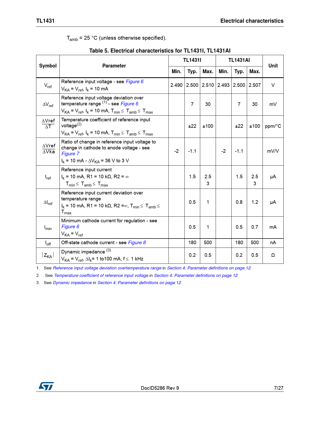 Pages / Page27 / 7 — TL1431. Electrical characteristics. Table 5. Electrical characteristics …
