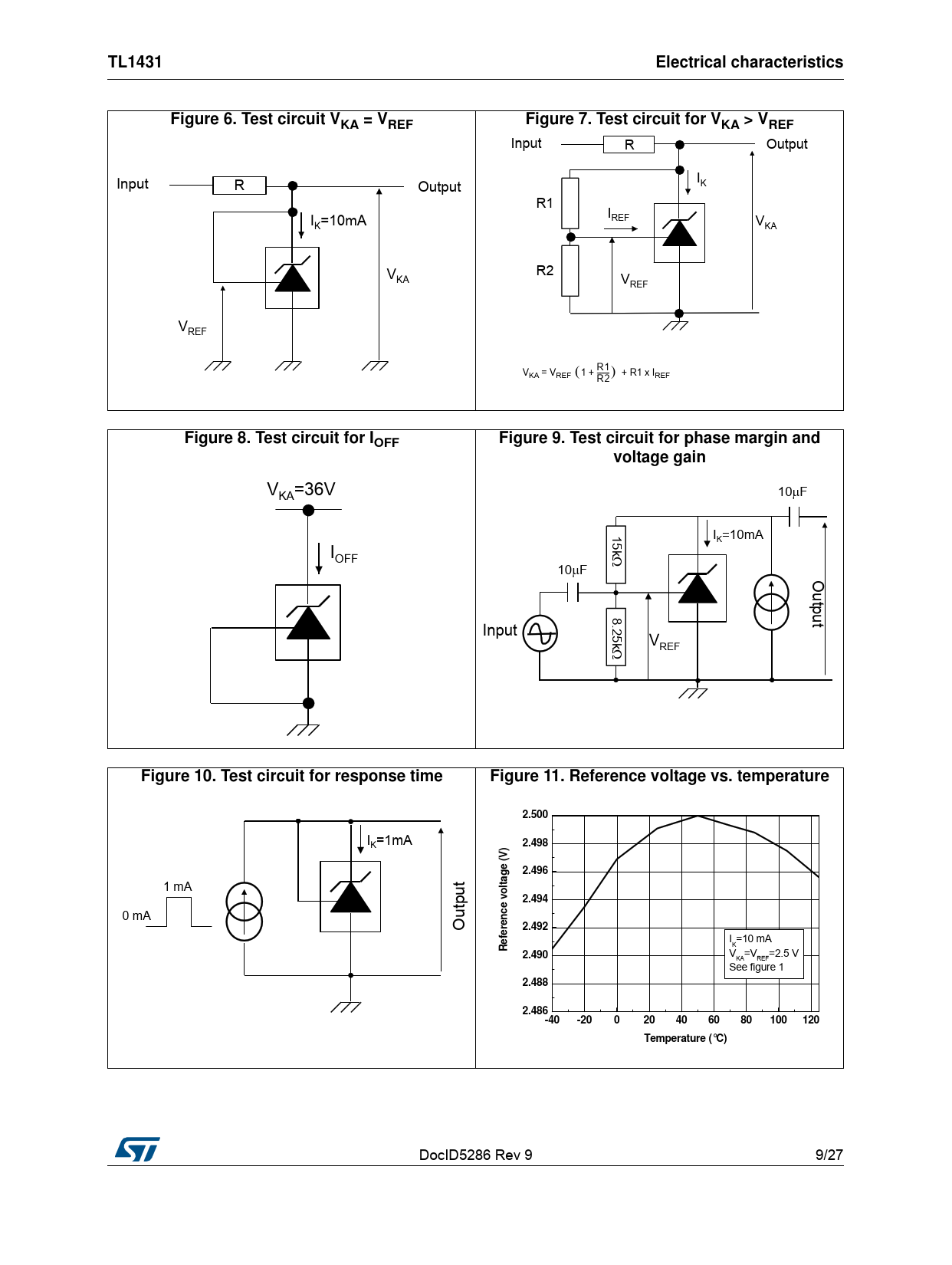 TL1431Electrical characteristicsFigure 6. Test circuit VKA = VREFFigure 7. Test circuit for VKA > VREF Input R Output Input R I Output K R1 I IREF K=10mA VKA V R2 KA VREF VREF V KA = VREF 1 R1 + ---- + R1 x IREF R2 Figure 8. Test circuit for IOFFFigure 9. Test circuit for phase margin andvoltage gain VKA=36V 10F 15 I =10mA K I k OFF 10F Ou tp 8.2 ut Input 5k VREF Figure 10. Test circuit for response timeFigure 11. Reference voltage vs. temperature2.500 I =1mA K 2.498) V e ( t g2.496 1 mA u ta tp 2.494 0 mA ce vol Ou n re2.492fe e I =10 mA K R2.490 V =V =2.5 V KA REF See figure 1 2.4882.486-40 -20020406080100120Temperature (°C) DocID5286 Rev 9 9/27 27 Document Outline 1 Schematic diagrams Figure 1. TO-92 pin connections (top view) Figure 2. SO-8 batwing pin connections (top view) Figure 3. SOT23-5L and SOT23-3L pin connections (top view) Figure 4. SOT323-6L pin connections (top view) Figure 5. Block diagram 2 Absolute maximum ratings and operating conditions Table 1. Absolute maximum ratings Table 2. Operating conditions Table 3. Thermal data 3 Electrical characteristics Table 4. Electrical characteristics for TL1431C, TL1431AC Table 5. Electrical characteristics for TL1431I, TL1431AI Table 6. Electrical characteristics for TL1431IY, TL1431AIY Figure 6. Test circuit VKA = VREF Figure 7. Test circuit for VKA > VREF Figure 8. Test circuit for IOFF Figure 9. Test circuit for phase margin and voltage gain Figure 10. Test circuit for response time Figure 11. Reference voltage vs. temperature Figure 12. Reference voltage vs. cathode current Figure 13. Reference voltage vs. cathode current (IK = 0 to 1 mA) Figure 14. Reference current vs. temperature Figure 15. Off-state cathode current vs. temperature Figure 16. Ratio of change in VREF to change in VKA vs. temperature Figure 17. Drift of RKA vs. temperature Figure 18. Maximum operating current vs. temperature Figure 19. Gain and phase vs. frequency Figure 20. Stability behavior with capacitive loads Figure 21. Maximum power dissipation Figure 22. Pulse response for IK = 1 mA 4 Parameter definitions 4.1 Reference input voltage deviation overtemperature range Figure 23. Reference input voltage deviation overtemperature range 4.2 Temperature coefficient of reference input voltage Figure 24. Temperature coefficient of reference input voltage 4.3 Dynamic impedance 5 Package information 5.1 SO-8 package information Figure 25. SO-8 package outline Table 7. SO-8 package mechanical data 5.2 TO-92 Ammopack package information Figure 26. TO-92 Ammopack package outline Table 8. TO-92 Ammopack package mechanical data 5.3 TO-92 (bulk) package information Figure 27. TO-92 bulk package outline Table 9. TO-92 bulk package mechanical data 5.4 SOT23-3L package information Figure 28. SOT23-3L package outline Table 10. SOT23-3L package mechanical data 5.5 SOT23-5L package information Figure 29. SOT23-5L package outline Table 11. SOT23-5L package mechanical data 5.6 SOT323-6L package information Figure 30. SOT323-6L package outline Table 12. SOT323-6L package mechanical data 5.7 SO-8 packing information Figure 31. SO-8 tape and reel outline Table 13. SO-8 tape and reel mechanical data 5.8 SOT23-3L packing information Figure 32. SOT23-3L tape outline (Carsem) 5.9 SOT23-5L packing information Figure 33. SOT23-5L tape outline (Carsem) 5.10 SOT323-6L packing information Figure 34. SOT323-6L tape outline Table 14. SOT323-6L tape mechanical data 6 Ordering information Table 15. Order code 7 Revision history Table 16. Document revision history