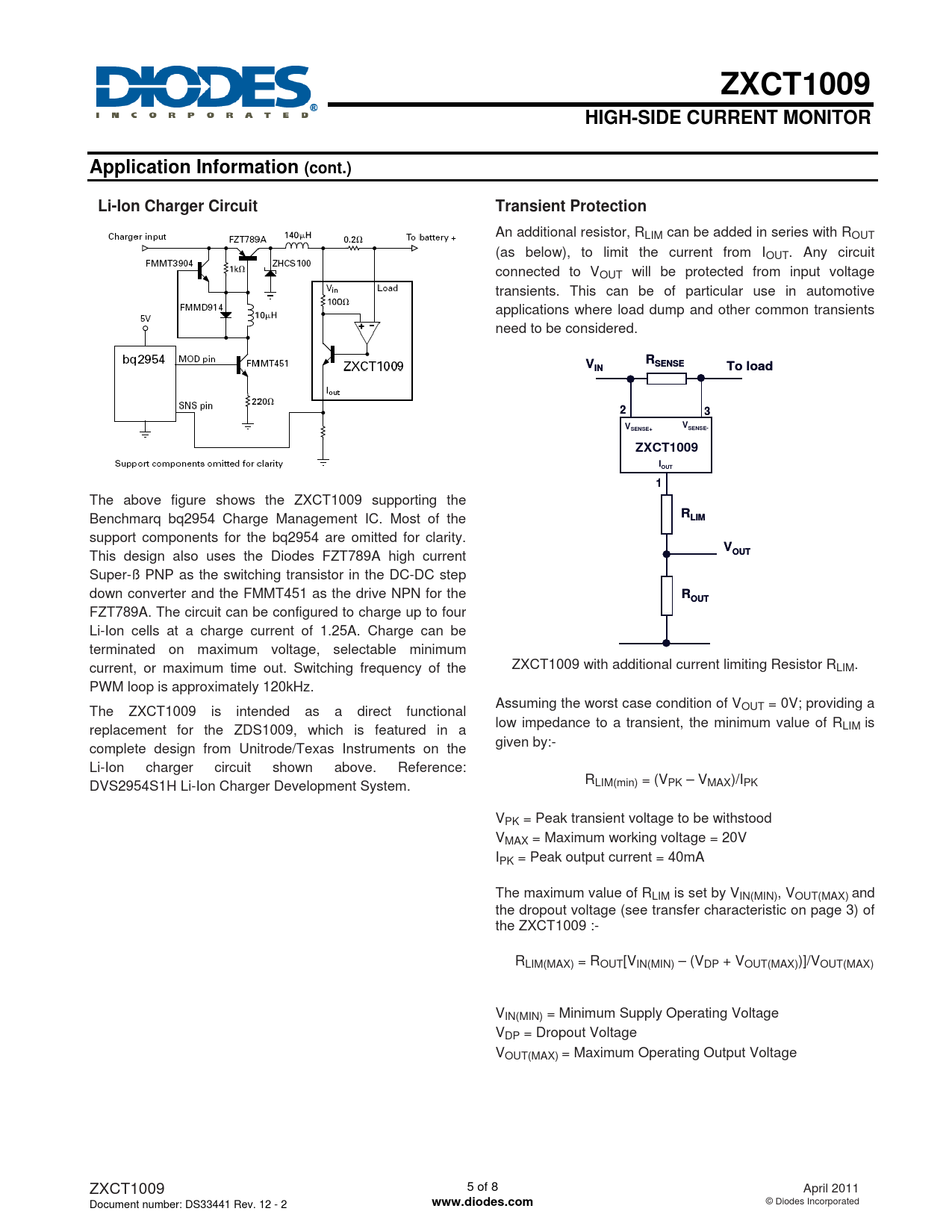 FZT789A. The circuit can be configured to charge up to four Li-Ion cells at a charge current of 1.25A. Charge can be terminated on maximum voltage, selectable minimum current, or maximum time out. Switching frequency of the ZXCT1009 with additional current limiting Resistor RLIM. PWM loop is approximately 120kHz. Assuming the worst case condition of V The ZXCT1009 is intended as a direct functional OUT = 0V; providing a low impedance to a transient, the minimum value of R replacement for the ZDS1009, which is featured in a LIM is given by:- complete design from Unitrode/Texas Instruments on the Li-Ion charger circuit shown above. Reference: DVS2954S1H Li-Ion Charger Development System. RLIM(min) = (VPK – VMAX)/IPK V PK = Peak transient voltage to be withstood VMAX = Maximum working voltage = 20V IPK = Peak output current = 40mA The maximum value of RLIM is set by VIN(MIN), VOUT(MAX) and the dropout voltage (see transfer characteristic on page 3) of the ZXCT1009 :- RLIM(MAX) = ROUT[VIN(MIN) – (VDP + VOUT(MAX))]/VOUT(MAX) VIN(MIN) = Minimum Supply Operating Voltage VDP = Dropout Voltage VOUT(MAX) = Maximum Operating Output Voltage ZXCT1009 5 of 8 April 2011 Document number: DS33441 Rev. 12 - 2
