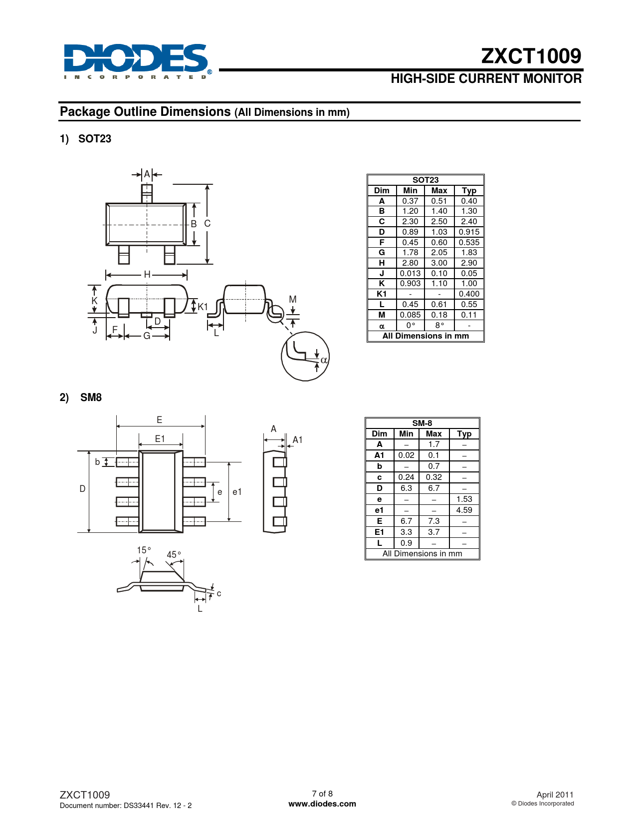 | Pages / Page | 8 / 7 — ZXCT1009. HIGH-SIDE CURRENT MONITOR. Package Outline Dimensions (All … |