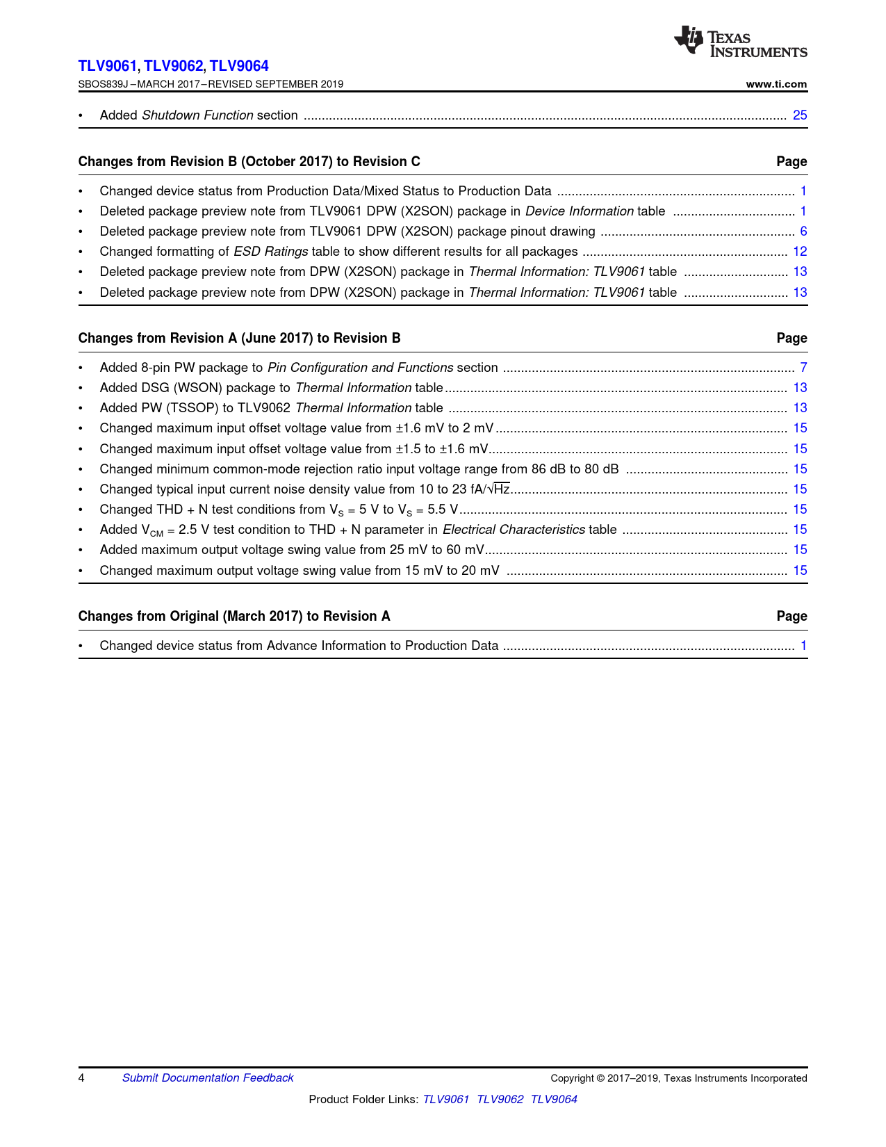 | Pages / Page | 82 / 4 — TLV9061,. TLV9062,. TLV9064. www.ti.com. Changes from Revision B (October … |