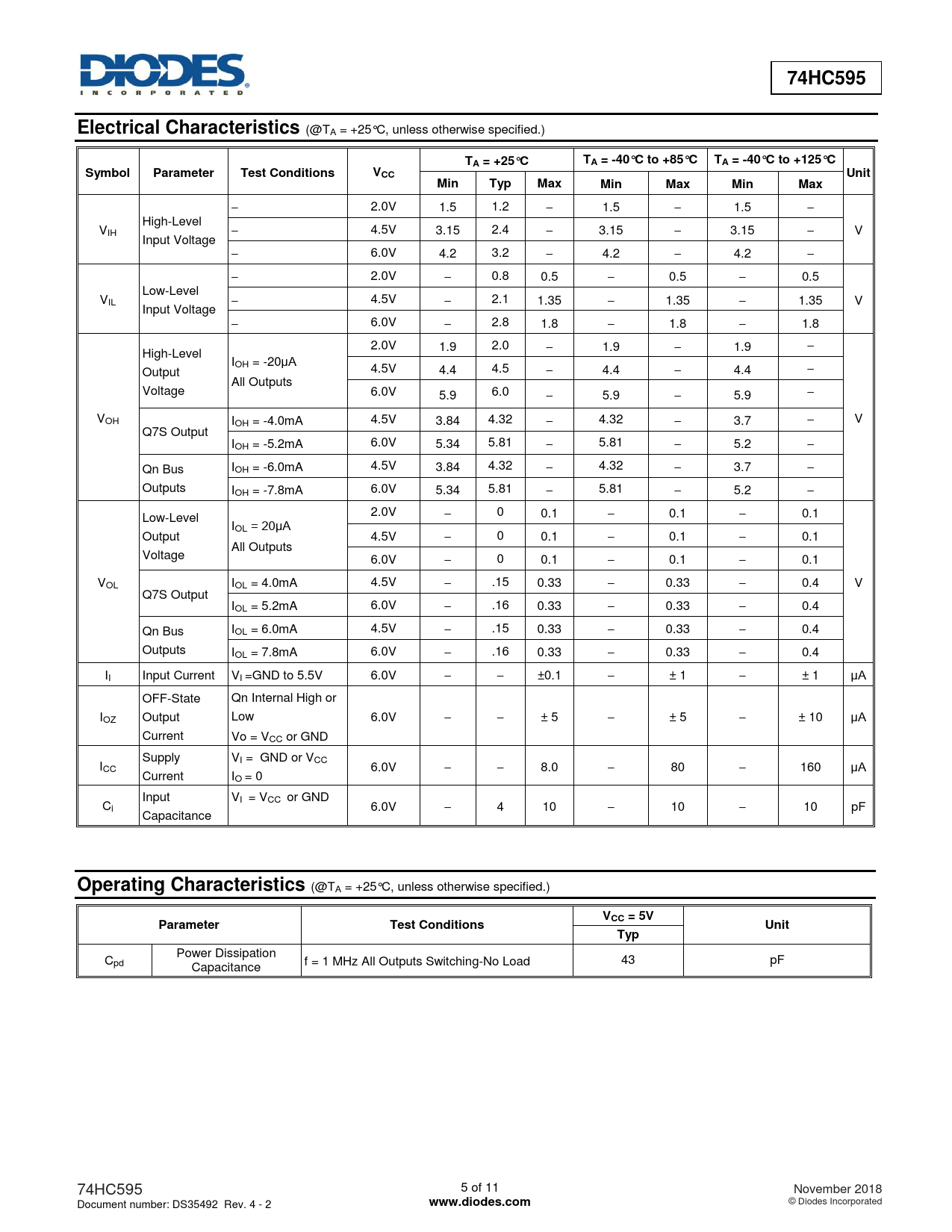 74HC595. Electrical Characteristics. TA = +25°C. TA = -40°C to +85°C. TA = -40°C to +125°C. Symbol. Parameter. Test Conditions. VCC. Unit