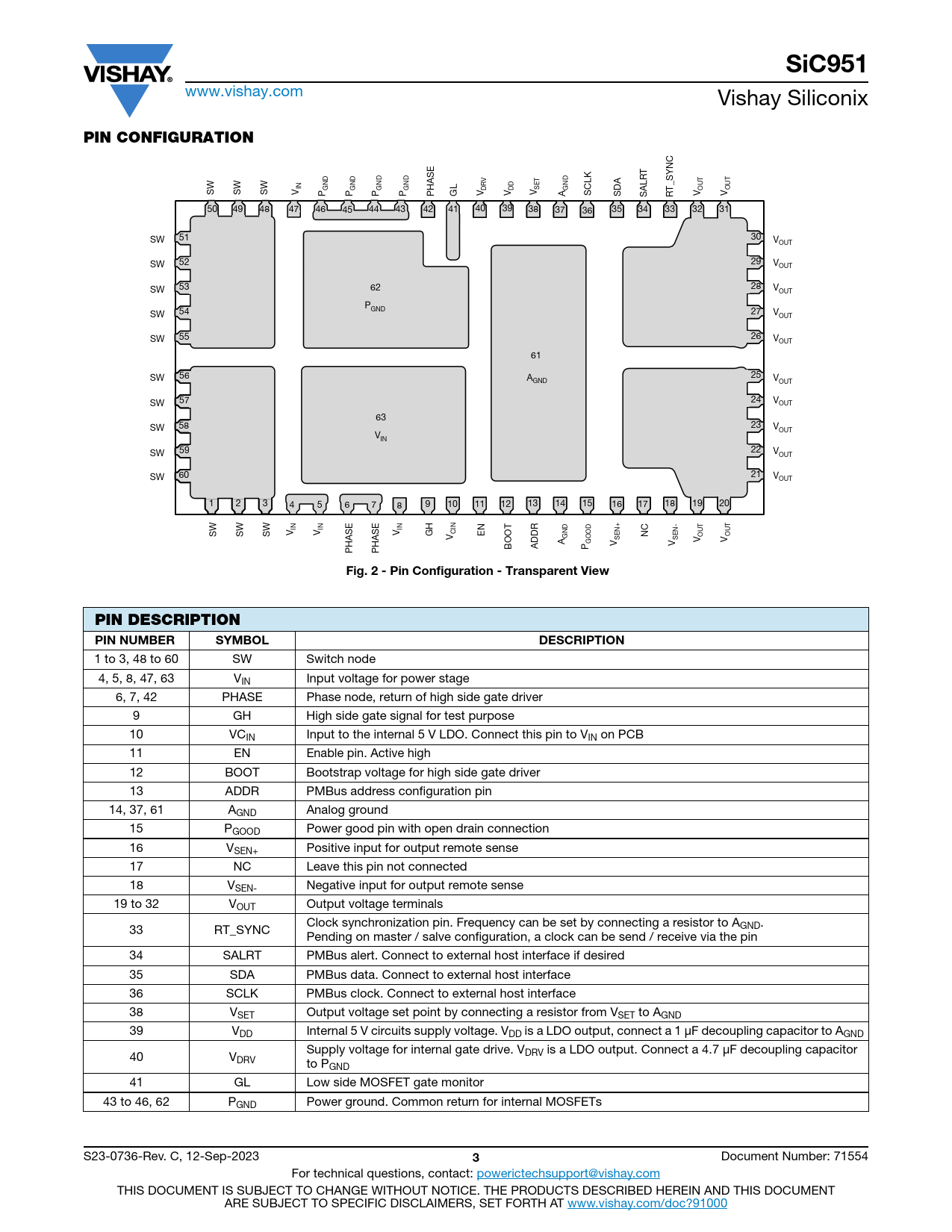 SiC951 www.vishay.com Vishay Siliconix PIN CONFIGURATION IN GND GND GND GND DRV DD SET GND OUT SW SW SW V OUT P P P P PHASE GL V V V A SCLK SDA SALRT RT_SYNC V V 50 49 48 47 46 45 44 43 42 41 40 39 38 37 36 35 34 33 32 31 51 51 30 SW V OUT 52 52 29 SW VOUT 53 53 62 28 SW VOUT P 54 54 GND 27 SW VOUT 55 55 26 SW VOUT 61 56 56 25 SW A V GND OUT 57 57 24 SW VOUT 63 58 58 23 SW VOUT V IN 59 59 22 SW VOUT 60 60 21 SW VOUT 1 2 3 4 5 6 7 8 9 10 11 12 13 14 15 16 17 18 19 20 IN IN IN SW SW SW V V CIN V GH V EN OT GND NC OUT OUT A SEN+ SEN- GOOD V V BO ADDR V V PHASE PHASE P Fig. 2 - Pin Configuration - Transparent ViewPIN DESCRIPTION PIN NUMBERSYMBOLDESCRIPTION 1 to 3, 48 to 60 SW Switch node 4, 5, 8, 47, 63 VIN Input voltage for power stage 6, 7, 42 PHASE Phase node, return of high side gate driver 9 GH High side gate signal for test purpose 10 VCIN Input to the internal 5 V LDO. Connect this pin to VIN on PCB 11 EN Enable pin. Active high 12 BOOT Bootstrap voltage for high side gate driver 13 ADDR PMBus address configuration pin 14, 37, 61 AGND Analog ground 15 PGOOD Power good pin with open drain connection 16 VSEN+ Positive input for output remote sense 17 NC Leave this pin not connected 18 VSEN- Negative input for output remote sense 19 to 32 VOUT Output voltage terminals Clock synchronization pin. Frequency can be set by connecting a resistor to A 33 RT_SYNC GND. Pending on master / salve configuration, a clock can be send / receive via the pin 34 SALRT PMBus alert. Connect to external host interface if desired 35 SDA PMBus data. Connect to external host interface 36 SCLK PMBus clock. Connect to external host interface 38 VSET Output voltage set point by connecting a resistor from VSET to AGND 39 VDD Internal 5 V circuits supply voltage. VDD is a LDO output, connect a 1 μF decoupling capacitor to AGND Supply voltage for internal gate drive. V 40 V DRV is a LDO output. Connect a 4.7 μF decoupling capacitor DRV to PGND 41 GL Low side MOSFET gate monitor 43 to 46, 62 PGND Power ground. Common return for internal MOSFETs S23-0736-Rev. C, 12-Sep-2023 3 Document Number: 71554 For technical questions, contact: powerictechsupport@vishay.com THIS DOCUMENT IS SUBJECT TO CHANGE WITHOUT NOTICE. THE PRODUCTS DESCRIBED HEREIN AND THIS DOCUMENT ARE SUBJECT TO SPECIFIC DISCLAIMERS, SET FORTH AT www.vishay.com/doc?91000