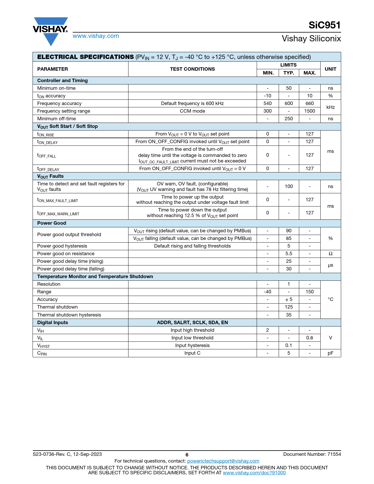 SiC951 ELECTRICAL SPECIFICATIONS LIMITS PARAMETER TEST CONDITIONS UNIT MIN TYP MAX Controller and Timing