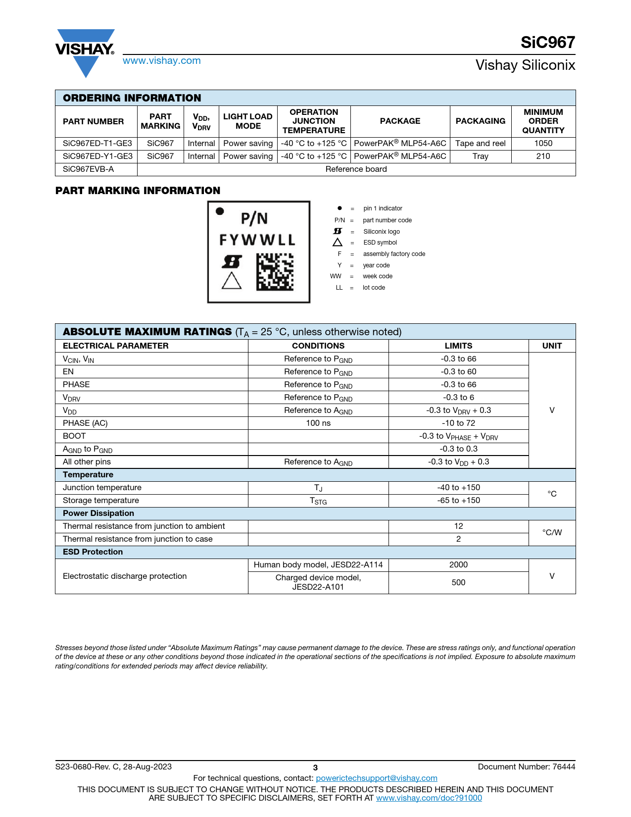 SiC967 www.vishay.com Vishay Siliconix ORDERING INFORMATIONOPERATIONMINIMUMPARTVLIGHT LOADPART NUMBERDD,JUNCTIONPACKAGEPACKAGINGORDERMARKINGVDRVMODETEMPERATUREQUANTITY SiC967ED-T1-GE3 SiC967 Internal Power saving -40 °C to +125 °C PowerPAK® MLP54-A6C Tape and reel 1050 SiC967ED-Y1-GE3 SiC967 Internal Power saving -40 °C to +125 °C PowerPAK® MLP54-A6C Tray 210 SiC967EVB-A Reference board PART MARKING INFORMATION = pin 1 indicator P/N = part number code = Siliconix logo = ESD symbol F = assembly factory code Y = year code WW = week code LL = lot code ABSOLUTE MAXIMUM RATINGS (TA = 25 °C, unless otherwise noted) ELECTRICAL PARAMETERCONDITIONSLIMITSUNIT VCIN, VIN Reference to PGND -0.3 to 66 EN Reference to PGND -0.3 to 60 PHASE Reference to PGND -0.3 to 66 VDRV Reference to PGND -0.3 to 6 VDD Reference to AGND -0.3 to VDRV + 0.3 V PHASE (AC) 100 ns -10 to 72 BOOT -0.3 to VPHASE + VDRV AGND to PGND -0.3 to 0.3 All other pins Reference to AGND -0.3 to VDD + 0.3 Temperature Junction temperature TJ -40 to +150 °C Storage temperature TSTG -65 to +150 Power Dissipation Thermal resistance from junction to ambient 12 °C/W Thermal resistance from junction to case 2 ESD Protection Human body model, JESD22-A114 2000 Electrostatic discharge protection V Charged device model, 500 JESD22-A101 Stresses beyond those listed under “Absolute Maximum Ratings” may cause permanent damage to the device. These are stress ratings only, and functional operation of the device at these or any other conditions beyond those indicated in the operational sections of the specifications is not implied. Exposure to absolute maximum rating/conditions for extended periods may affect device reliability. S23-0680-Rev. C, 28-Aug-2023 3 Document Number: 76444 For technical questions, contact: powerictechsupport@vishay.com THIS DOCUMENT IS SUBJECT TO CHANGE WITHOUT NOTICE. THE PRODUCTS DESCRIBED HEREIN AND THIS DOCUMENT ARE SUBJECT TO SPECIFIC DISCLAIMERS, SET FORTH AT www.vishay.com/doc?91000