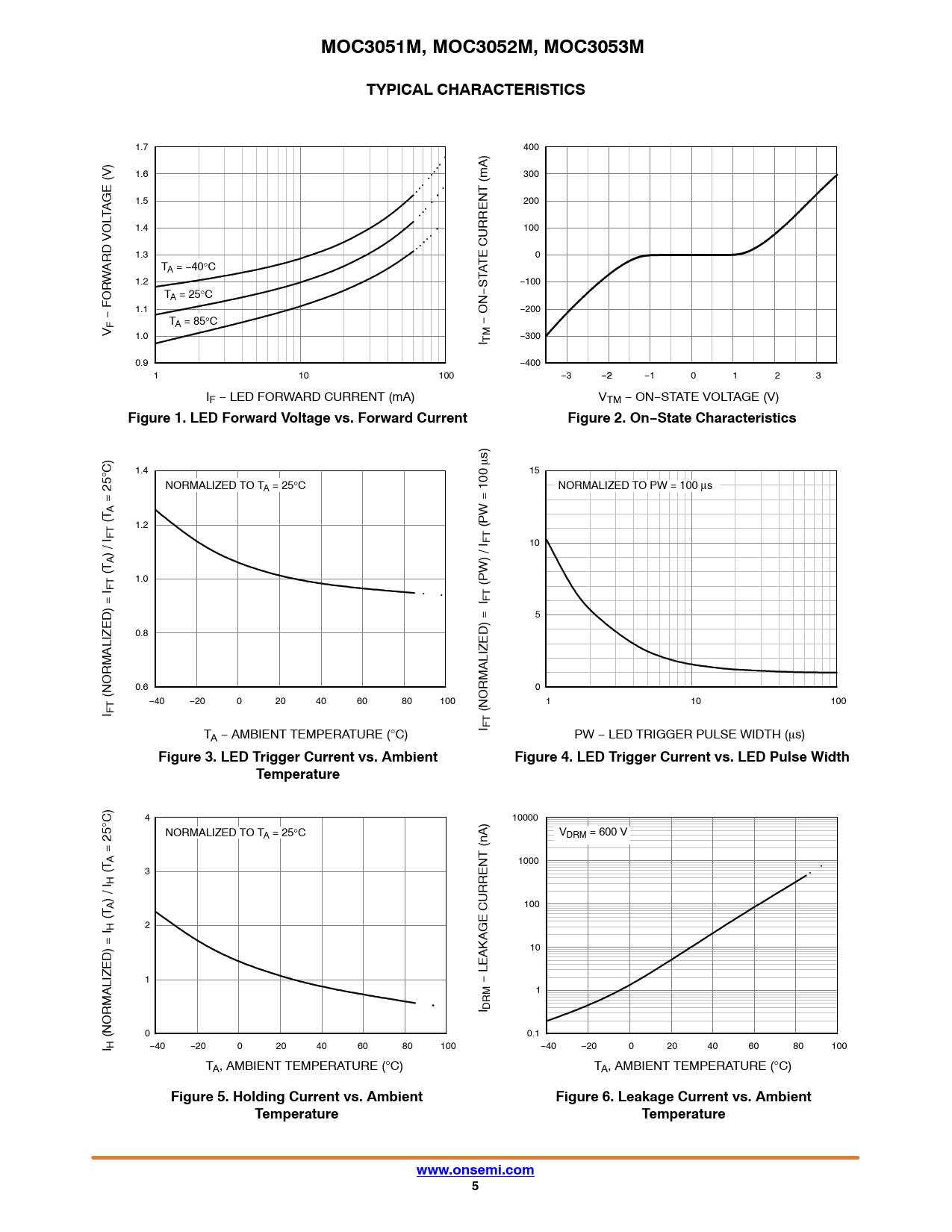 MOC3051M, MOC3052M, MOC3053MTYPICAL CHARACTERISTICS 1.7 400 (V) 1.6 300 1.5 200 TAGE 1.4 100 1.3 0 ARD VOL TA = −40°C W TATE CURRENT (mA) R 1.2 −100 O −S TA = 25°C 1.1 −200 − F TA = 85°C − ON V F 1.0 I TM −300 0.9 −400 1 10 100 −3 −2 − −1 0 1 2 3 IF − LED FORWARD CURRENT (mA) VTM − ON−STATE VOLTAGE (V) Figure 1. LED Forward Voltage vs. Forward CurrentFigure 2. On−State Characteristics ms) °C) 1.4 15 NORMALIZED TO TA = 25°C NORMALIZED TO PW = 100 μs = 25 A (T 1.2 (PW = 100 FT FT 10 ) / I A (T 1.0 FT (PW) / I FT 5 0.8 0.6 0 (NORMALIZED) = I −40 −20 0 20 40 60 80 100 1 10 100 I FT (NORMALIZED) = I I FT TA − AMBIENT TEMPERATURE (°C) PW − LED TRIGGER PULSE WIDTH (ms) Figure 3. LED Trigger Current vs. AmbientFigure 4. LED Trigger Current vs. LED Pulse WidthTemperature °C) 4 10000 NORMALIZED TO TA = 25°C VDRM = 600 V = 25 A 1000 (T 3 H ) / I A 100 (T H 2 10 1 − LEAKAGE CURRENT (nA) 1 I DRM (NORMALIZED) = I 0 0.1 I H −40 −20 0 20 40 60 80 100 −40 −20 0 20 40 60 80 100 TA, AMBIENT TEMPERATURE (°C) TA, AMBIENT TEMPERATURE (°C) Figure 5. Holding Current vs. AmbientFigure 6. Leakage Current vs. AmbientTemperatureTemperaturewww.onsemi.com5