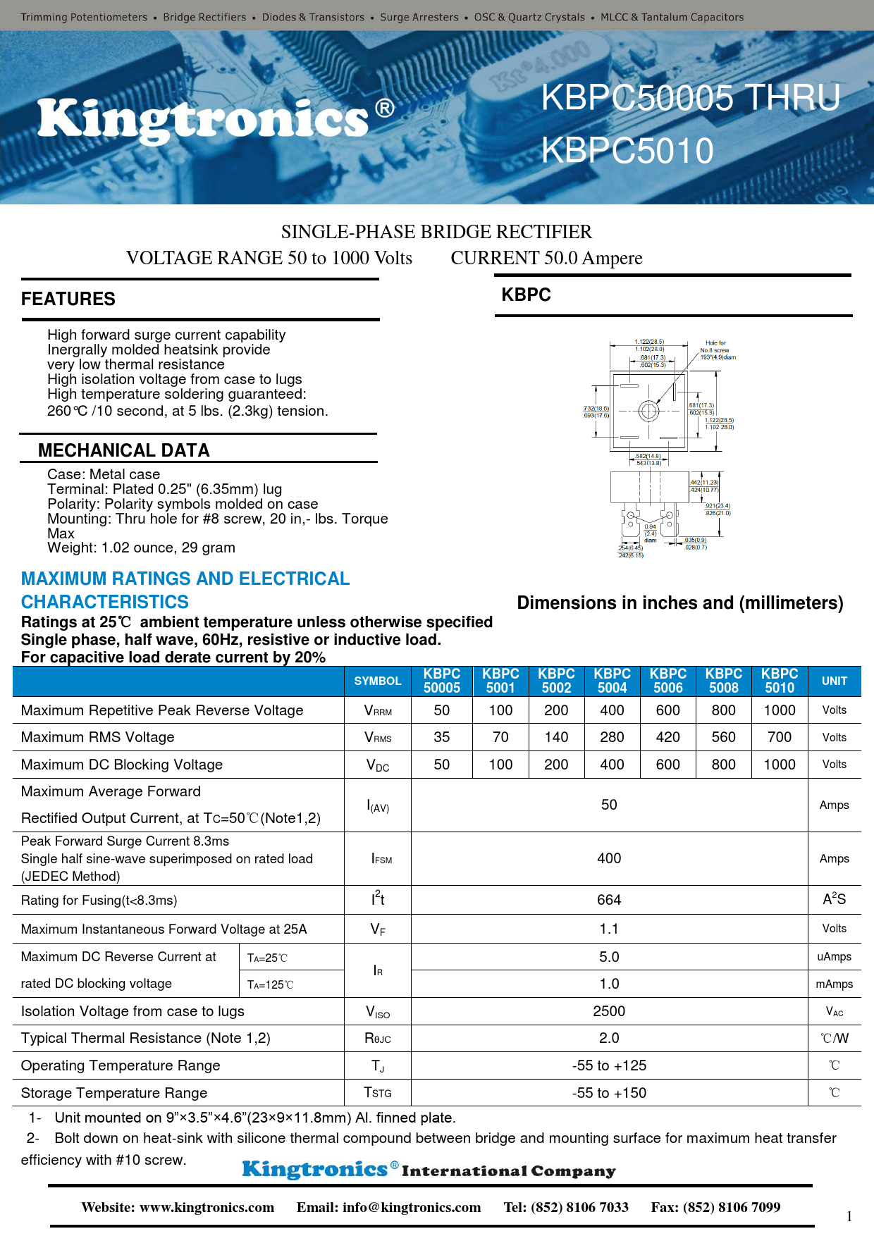 Datasheet KBPC50005, KBPC5001, KBPC5002, KBPC5004, KBPC5006, KBPC5008, KBPC5010 Kingtronics