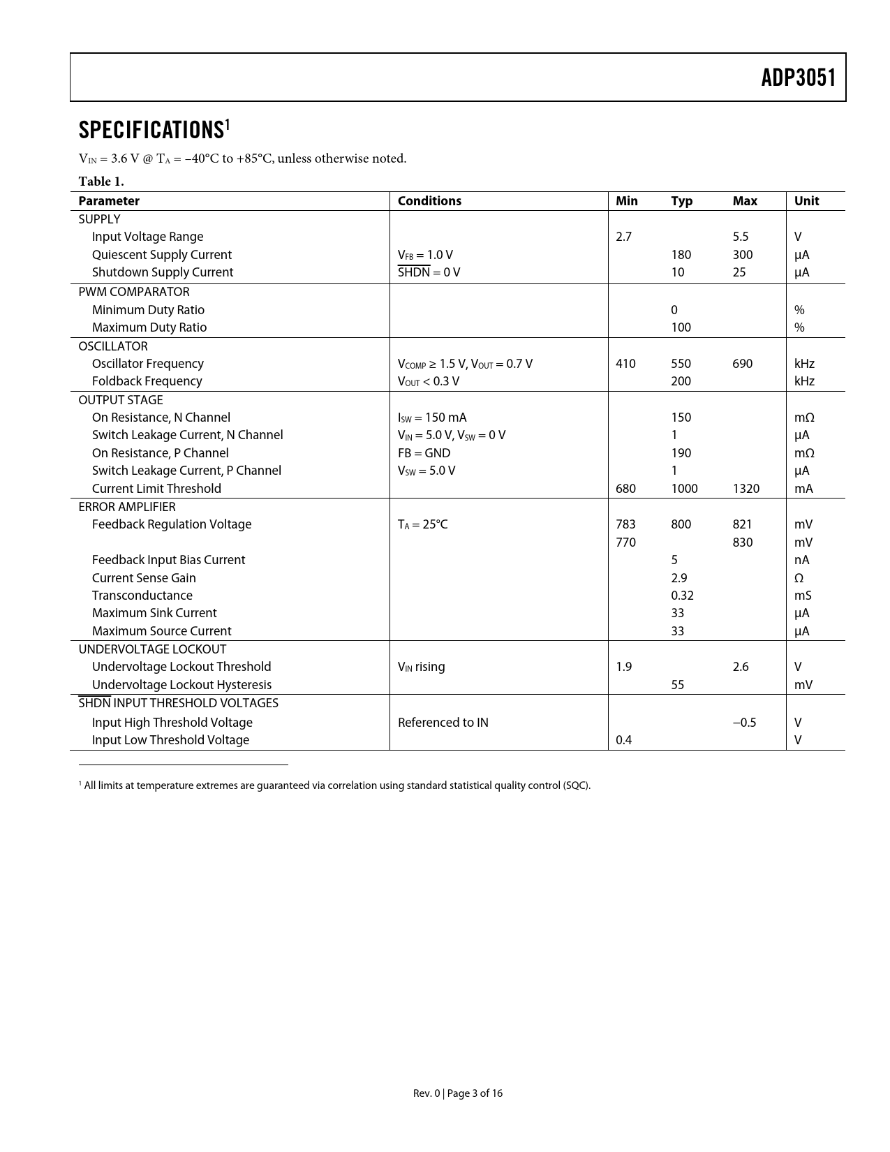 ADP3051 SPECIFICATIONS1 Table 1 Parameter Conditions Min Typ Max Unit