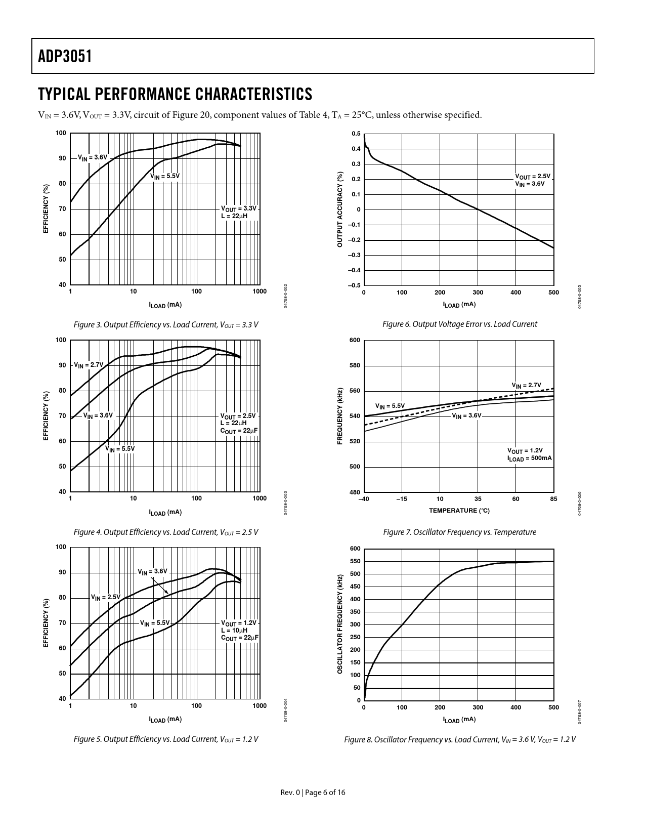 ADP3051. TYPICAL PERFORMANCE CHARACTERISTICS. 100. 0.5. 0.4. VIN = 3.6V. 0.3. VIN = 5.5V. 0.2. VOUT = 2.5V. (%). 0.1. NCY. VOUT = 3.3V. L = 22
