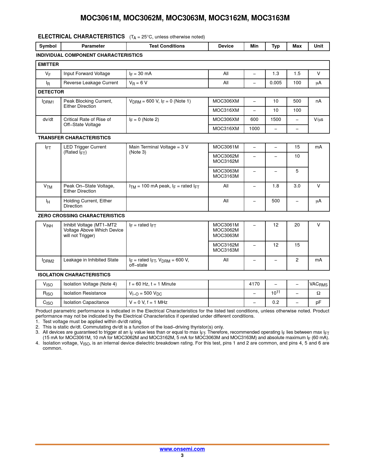 VISO Isolation Voltage (Note 4) f = 60 Hz, t = 1 Minute 4170 − − VACRMS RISO Isolation Resistance VI−O = 500 VDC − 1011 − W CISO Isolation Capacitance V = 0 V, f = 1 MHz − 0.2 − pF Product parametric performance is indicated in the Electrical Characteristics for the listed test conditions, unless otherwise noted. Product performance may not be indicated by the Electrical Characteristics if operated under different conditions. 1. Test voltage must be applied within dv/dt rating. 2. This is static dv/dt. Commutating dv/dt is a function of the load−driving thyristor(s) only. 3. All devices are guaranteed to trigger at an IF value less than or equal to max IFT. Therefore, recommended operating IF lies between max IFT (15 mA for MOC3061M, 10 mA for MOC3062M and MOC3162M, 5 mA for MOC3063M and MOC3163M) and absolute maximum IF (60 mA). 4. Isolation voltage, VISO, is an internal device dielectric breakdown rating. For this test, pins 1 and 2 are common, and pins 4, 5 and 6 are common.