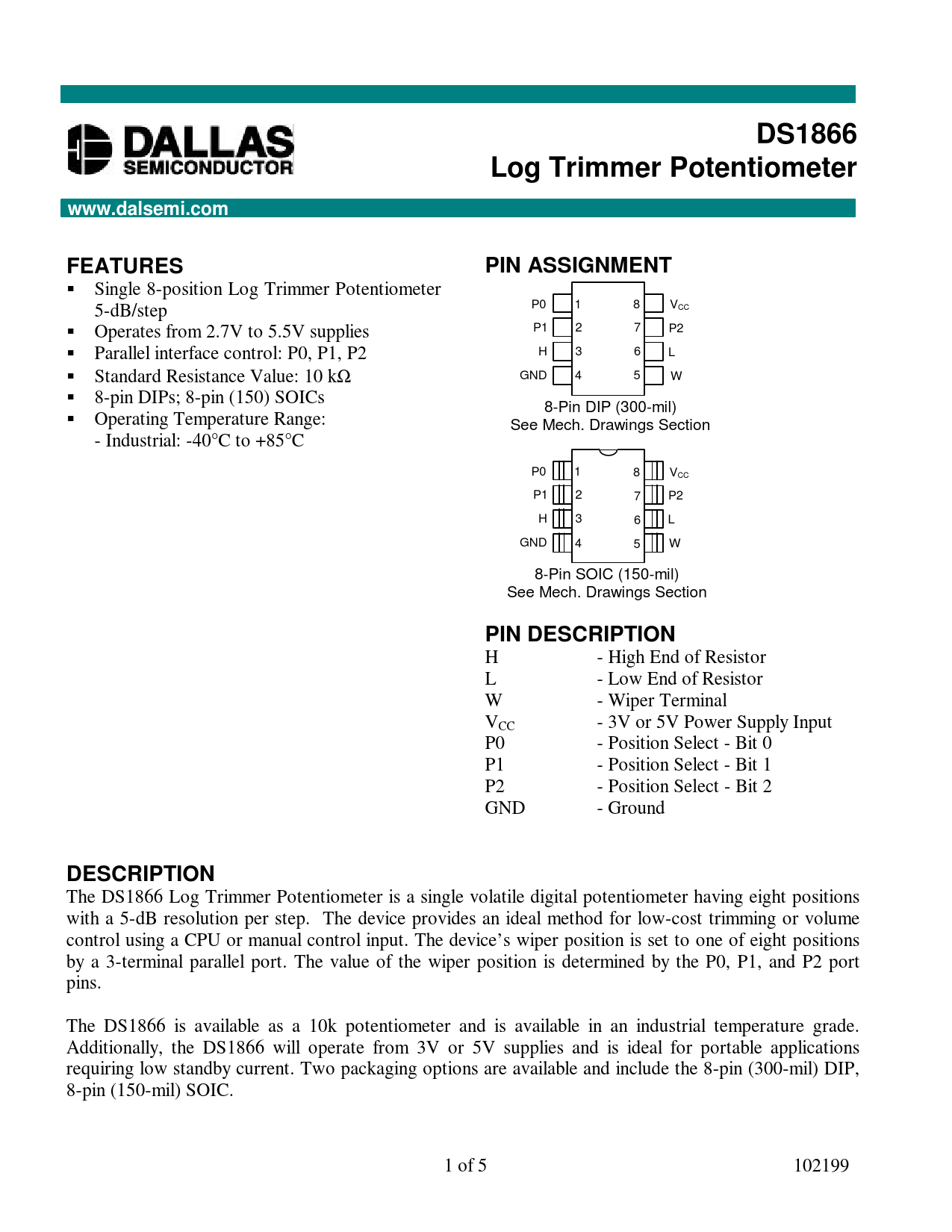 Pages / Page5 / 1 — DS1866. Log Trimmer Potentiometer. www.dalsemi.com. FEATURES. PIN …