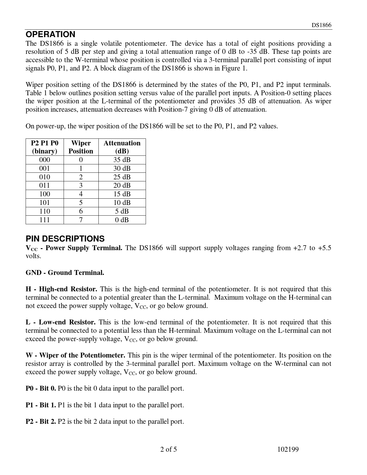 The DS1866 is a single volatile potentiometer. The device has a total of eight positions providing a resolution of 5 dB per step and giving a total attenuation range of 0 dB to -35 dB. These tap points are accessible to the W-terminal whose position is controlled via a 3-terminal parallel port consisting of input signals P0, P1, and P2. A block diagram of the DS1866 is shown in Figure 1. Wiper position setting of the DS1866 is determined by the states of the P0, P1, and P2 input terminals. Table 1 below outlines position setting versus value of the parallel port inputs. A Position-0 setting places the wiper position at the L-terminal of the potentiometer and provides 35 dB of attenuation. As wiper position increases, attenuation decreases with Position-7 giving 0 dB of attenuation. On power-up, the wiper position of the DS1866 will be set to the P0, P1, and P2 values.