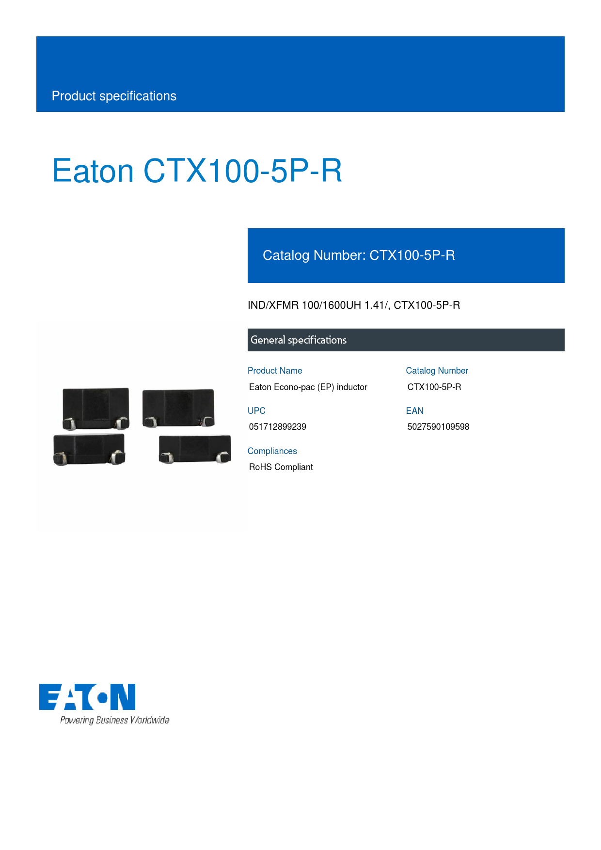 Product specifications Eaton CTX100-5P-R Catalog Number: CTX100-5P-R IND/XFMR 100/1600UH 1.41/, CTX100-5P-R General specifications Product Name Catalog Number Eaton Econo-pac (EP) inductor CTX100-5P-R UPC EAN 051712899239 5027590109598 Compliances RoHS Compliant