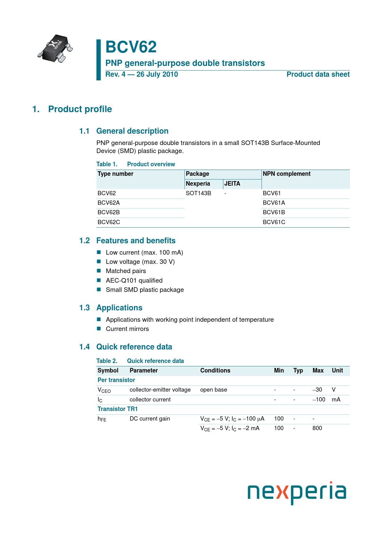 BCV62 PNP general-purpose double transistors. Rev. 4 — 26 July 2010. Product data sheet. Product. profile
