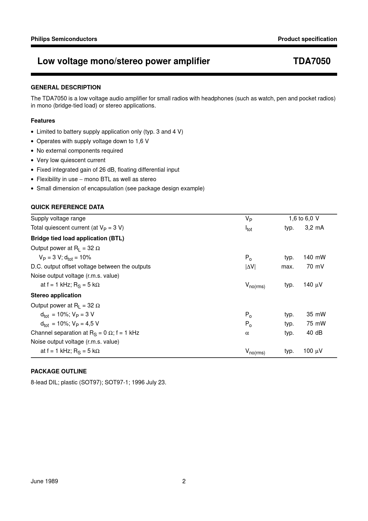 Philips SemiconductorsProduct specificationLow voltage mono/stereo power amplifierTDA7050GENERAL DESCRIPTION The TDA7050 is a low voltage audio amplifier for small radios with headphones (such as watch, pen and pocket radios) in mono (bridge-tied load) or stereo applications. Features • Limited to battery supply application only (typ. 3 and 4 V) • Operates with supply voltage down to 1,6 V • No external components required • Very low quiescent current • Fixed integrated gain of 26 dB, floating differential input • Flexibility in use − mono BTL as well as stereo • Small dimension of encapsulation (see package design example) QUICK REFERENCE DATA Supply voltage range VP 1,6 to 6,0 V Total quiescent current (at VP = 3 V) Itot typ. 3,2 mA Bridge tied load application (BTL) Output power at RL = 32 Ω VP = 3 V; dtot = 10% Po typ. 140 mW D.C. output offset voltage between the outputs |∆V| max. 70 mV Noise output voltage (r.m.s. value) at f = 1 kHz; RS = 5 kΩ Vno(rms) typ. 140 µV Stereo application Output power at RL = 32 Ω dtot = 10%; VP = 3 V Po typ. 35 mW dtot = 10%; VP = 4,5 V Po typ. 75 mW Channel separation at RS = 0 Ω; f = 1 kHz α typ. 40 dB Noise output voltage (r.m.s. value) at f = 1 kHz; RS = 5 kΩ Vno(rms) typ. 100 µV PACKAGE OUTLINE 8-lead DIL; plastic (SOT97); SOT97-1; 1996 July 23. June 1989 2