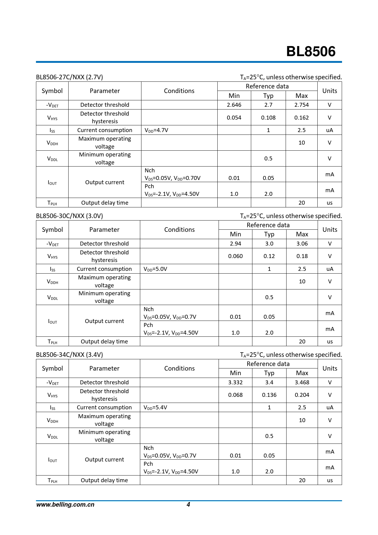 BL8506-27C/NXX (2.7V) TA=25C, unless otherwise specified. Reference data Symbol Parameter Conditions Units Min Typ Max -VDET Detector threshold 2.646 2.7 2.754 V Detector threshold VHYS 0.054 0.108 0.162 V hysteresis ISS Current consumption VDD=4.7V 1 2.5 uA Maximum operating VDDH 10 V voltage Minimum operating VDDL 0.5 V voltage Nch mA V 0.01 0.05 I DS=0.05V, VDD=0.70V OUT Output current Pch mA VDS=-2.1V, VDD=4.50V 1.0 2.0 TPLH Output delay time 20 us BL8506-30C/NXX (3.0V) TA=25C, unless otherwise specified. Reference data Symbol Parameter Conditions Units Min Typ Max -VDET Detector threshold 2.94 3.0 3.06 V Detector threshold VHYS 0.060 0.12 0.18 V hysteresis ISS Current consumption VDD=5.0V 1 2.5 uA Maximum operating VDDH 10 V voltage Minimum operating VDDL 0.5 V voltage Nch mA V 0.01 0.05 I DS=0.05V, VDD=0.7V OUT Output current Pch mA VDS=-2.1V, VDD=4.50V 1.0 2.0 TPLH Output delay time 20 us BL8506-34C/NXX (3.4V) TA=25C, unless otherwise specified. Reference data Symbol Parameter Conditions Units Min Typ Max -VDET Detector threshold 3.332 3.4 3.468 V Detector threshold VHYS 0.068 0.136 0.204 V hysteresis ISS Current consumption VDD=5.4V 1 2.5 uA Maximum operating VDDH 10 V voltage Minimum operating VDDL 0.5 V voltage Nch mA V 0.01 0.05 I DS=0.05V, VDD=0.7V OUT Output current Pch mA VDS=-2.1V, VDD=4.50V 1.0 2.0 TPLH Output delay time 20 us