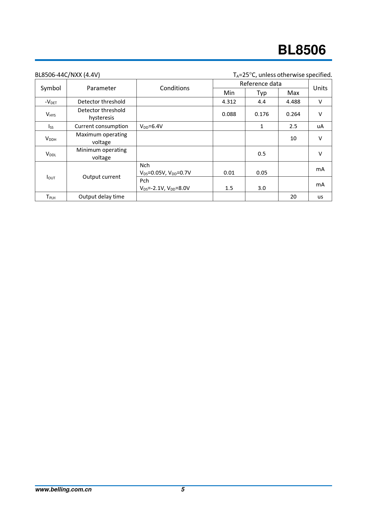 BL8506 BL8506-44C/NXX (4.4V) TA=25C, unless otherwise specified. Reference data Symbol Parameter Conditions Units Min Typ Max -VDET Detector threshold 4.312 4.4 4.488 V Detector threshold VHYS 0.088 0.176 0.264 V hysteresis ISS Current consumption VDD=6.4V 1 2.5 uA Maximum operating VDDH 10 V voltage Minimum operating VDDL 0.5 V voltage Nch mA V 0.01 0.05 I DS=0.05V, VDD=0.7V OUT Output current Pch mA VDS=-2.1V, VDD=8.0V 1.5 3.0 TPLH Output delay time 20 us www.belling.com.cn 5