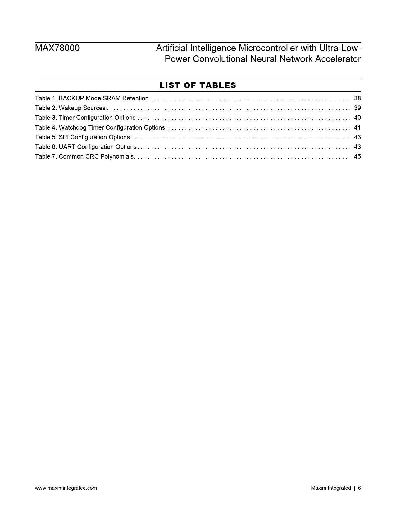 Model Line for this Datasheet Text Version of Document link to page 38 link to page 39 link to page 40 link to page 41 link to page 43 link to page 43 link to page 45 MAX78000 Artificial Intelligence Microcontroller with Ultra-Low- Power Convolutional Neural Network Accelerator LIST OF TABLES Table 1. BACKUP Mode SRAM Retention . 38 Table 2. Wakeup Sources . 39 Table 3. Timer Configuration Options . 40 Table 4. Watchdog Timer Configuration Options . 41 Table 5. SPI Configuration Options. 43 Table 6. UART Configuration Options. 43 Table 7. Common CRC Polynomials. 45 www.maximintegrated.com Maxim Integrated | 6 Document Outline General Description Applications Benefits and Features Simplified Block Diagram Absolute Maximum Ratings Package Information 81-CTBGA Electrical Characteristics Electrical Characteristics (continued) Electrical Characteristics—SPI Electrical Characteristics—SPI (continued) Electrical Characteristics—I2C Electrical Characteristics—I2C (continued) Electrical Characteristics—I2S Electrical Characteristics—I2S (continued) Electrical Characteristics—PCIF Electrical Characteristics—1-Wire Master Electrical Characteristics—1-Wire Master (continued) Pin Configuration 81 CTBGA Pin Description 81 CTBGA Detailed Description Arm Cortex-M4 with FPU Processor and RISC-V RV32 Processor Convolutional Neural Network Accelerator (CNN) Memory Internal Flash Memory Internal SRAM Comparators Dynamic Voltage Scaling (DVS) Controller Clocking Scheme General-Purpose I/O and Special Function Pins Parallel Camera Interface (PCIF) Analog-to-Digital Converter Single-Inductor Multiple-Output Switch-Mode Power Supply (SIMO SMPS) Power Management Power Management Unit ACTIVE Mode SLEEP Mode LOW POWER Mode (LPM) MICRO POWER Mode (μPM) STANDBY Mode BACKUP Mode POWER DOWN Mode (PDM) Wakeup Sources Real-Time Clock Programmable Timers 32-Bit Timer/Counter/PWM (TMR, LPTMR) Watchdog Timer (WDT) Pulse Train Engine (PT) Serial Peripherals I2C Interface (I2C) I2S Interface (I2S) Serial Peripheral Interface (SPI) UART (UART, LPUART) 1-Wire Master (OWM) Standard DMA Controller Security AES True Random Number Generator (TRNG) Non-Deterministic Random Bit Generator (NDRBG) CRC Module Bootloader Secure Boot Debug and Development Interface (SWD, JTAG) Applications Information Bypass Capacitors Ordering Information Revision History
