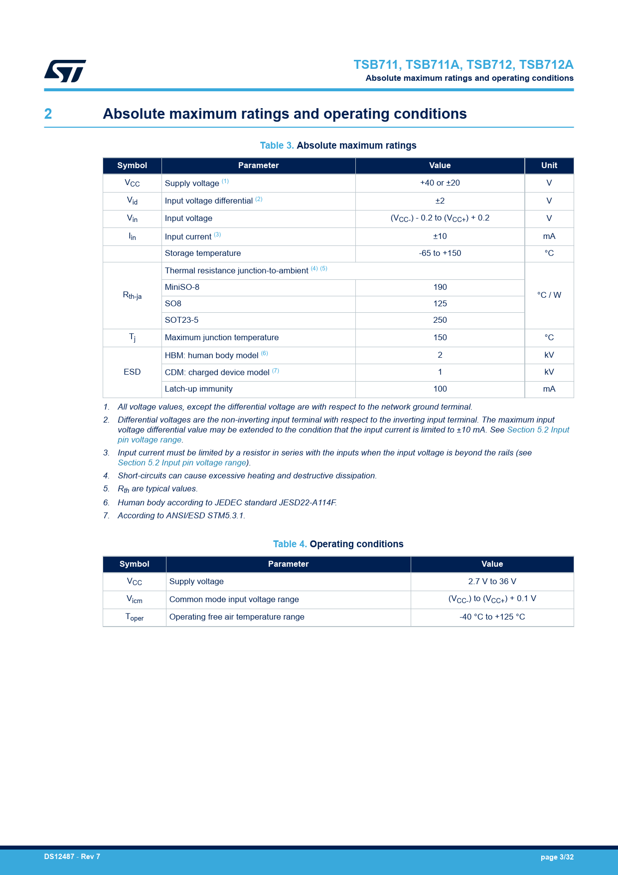 link to page 3 link to page 3 link to page 3 link to page 3 link to page 3 link to page 3 link to page 3 link to page 15 link to page 15 link to page 15 TSB711, TSB711A, TSB712, TSB712AAbsolute maximum ratings and operating conditions2Absolute maximum ratings and operating conditionsTable 3. Absolute maximum ratingsSymbolParameterValueUnit VCC Supply voltage (1) +40 or ±20 V Vid Input voltage differential (2) ±2 V Vin Input voltage (VCC-) - 0.2 to (VCC+) + 0.2 V Iin Input current (3) ±10 mA Storage temperature -65 to +150 °C Thermal resistance junction-to-ambient (4) (5) MiniSO-8 190 Rth-ja °C / W SO8 125 SOT23-5 250 Tj Maximum junction temperature 150 °C HBM: human body model (6) 2 kV ESD CDM: charged device model (7) 1 kV Latch-up immunity 100 mA 1. All voltage values, except the differential voltage are with respect to the network ground terminal. 2. Differential voltages are the non-inverting input terminal with respect to the inverting input terminal. The maximum input voltage differential value may be extended to the condition that the input current is limited to ±10 mA. See Section 5.2 Input pin voltage range. 3. Input current must be limited by a resistor in series with the inputs when the input voltage is beyond the rails (see Section 5.2 Input pin voltage range). 4. Short-circuits can cause excessive heating and destructive dissipation. 5. Rth are typical values. 6. Human body according to JEDEC standard JESD22-A114F. 7. According to ANSI/ESD STM5.3.1. Table 4. Operating conditionsSymbolParameterValue VCC Supply voltage 2.7 V to 36 V Vicm Common mode input voltage range (VCC-) to (VCC+) + 0.1 V Toper Operating free air temperature range -40 °C to +125 °C DS12487 - Rev 7page 3/32 Document Outline TSB711, TSB711A, TSB712, TSB712A 1 Pin description 2 Absolute maximum ratings and operating conditions 3 Electrical characteristics 4 Typical performance characteristics 5 Application information 5.1 Operating voltages 5.2 Input pin voltage range 5.3 Rail-to-rail input stage 5.4 Input offset voltage drift over the temperature 5.5 Long term input offset voltage drift 5.6 EMI rejection 5.7 Maximum power dissipation 5.8 Capacitive load and stability 5.9 PCB layout recommendations 5.10 Decoupling capacitor 6 Typical applications 6.1 Low-side current sensing 7 Package information 7.1 SOT23-5 package information 7.2 MiniSO8 package information 7.3 SO8 package information 8 Ordering information Revision history