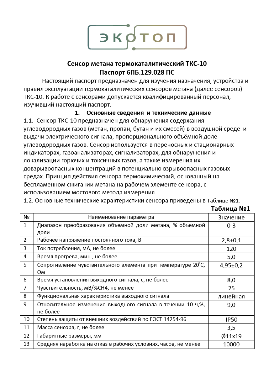Сенсор метана термокаталитический ТКС-10. Паспорт 6ПБ.129.028 ПС. Основные сведения и технические данные. Таблица №1