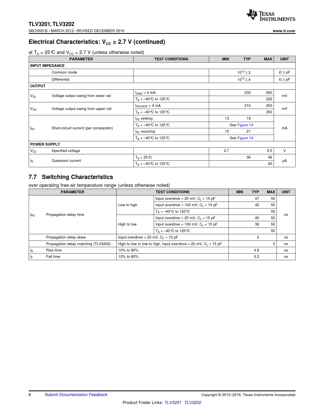 TLV3201,. TLV3202. www.ti.com. Electrical Characteristics: VCC = 2.7 V (continued). PARAMETER. TEST CONDITIONS. MIN. TYP. MAX. UNIT
